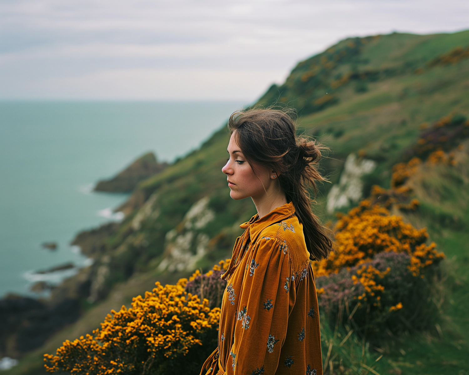 Serene woman in a mustard floral dress stands on a cliffside, eyes closed, with a lush landscape and turquoise sea in the background.
