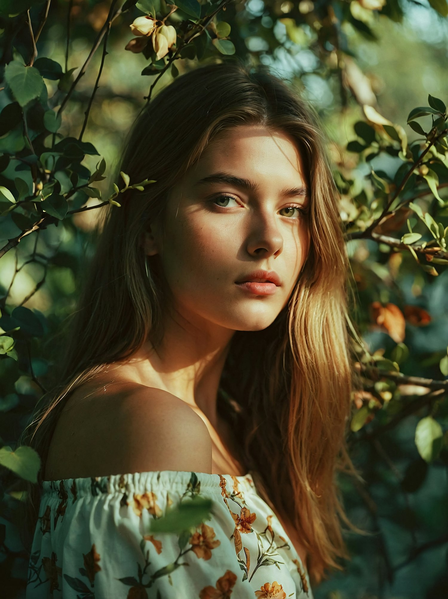 A serene portrait of a young woman with green eyes and floral dress, surrounded by lush foliage and dappled sunlight.