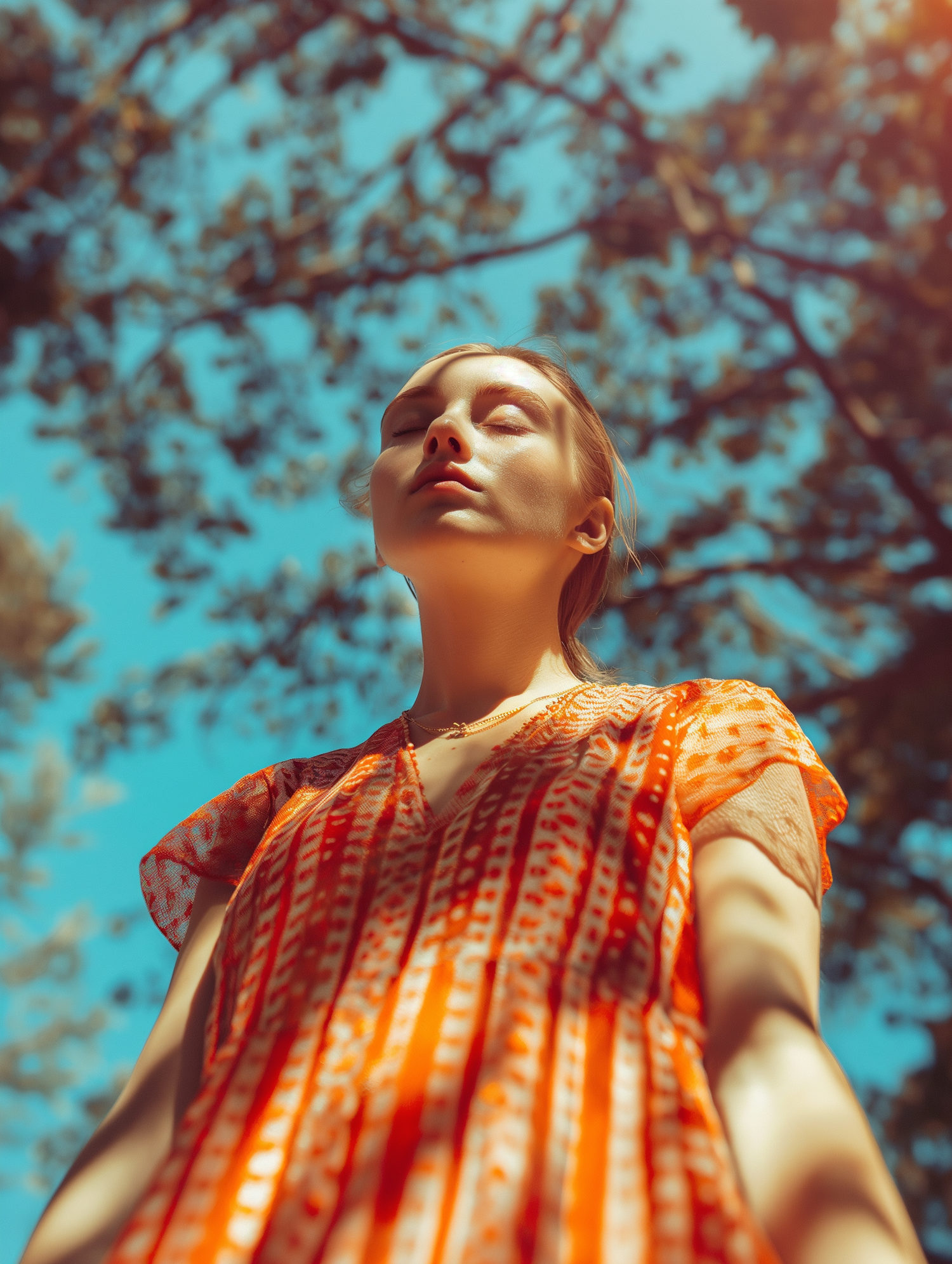 A serene portrait of a woman in an orange patterned dress, basking in sunlight under a blue sky with blurred tree branches.