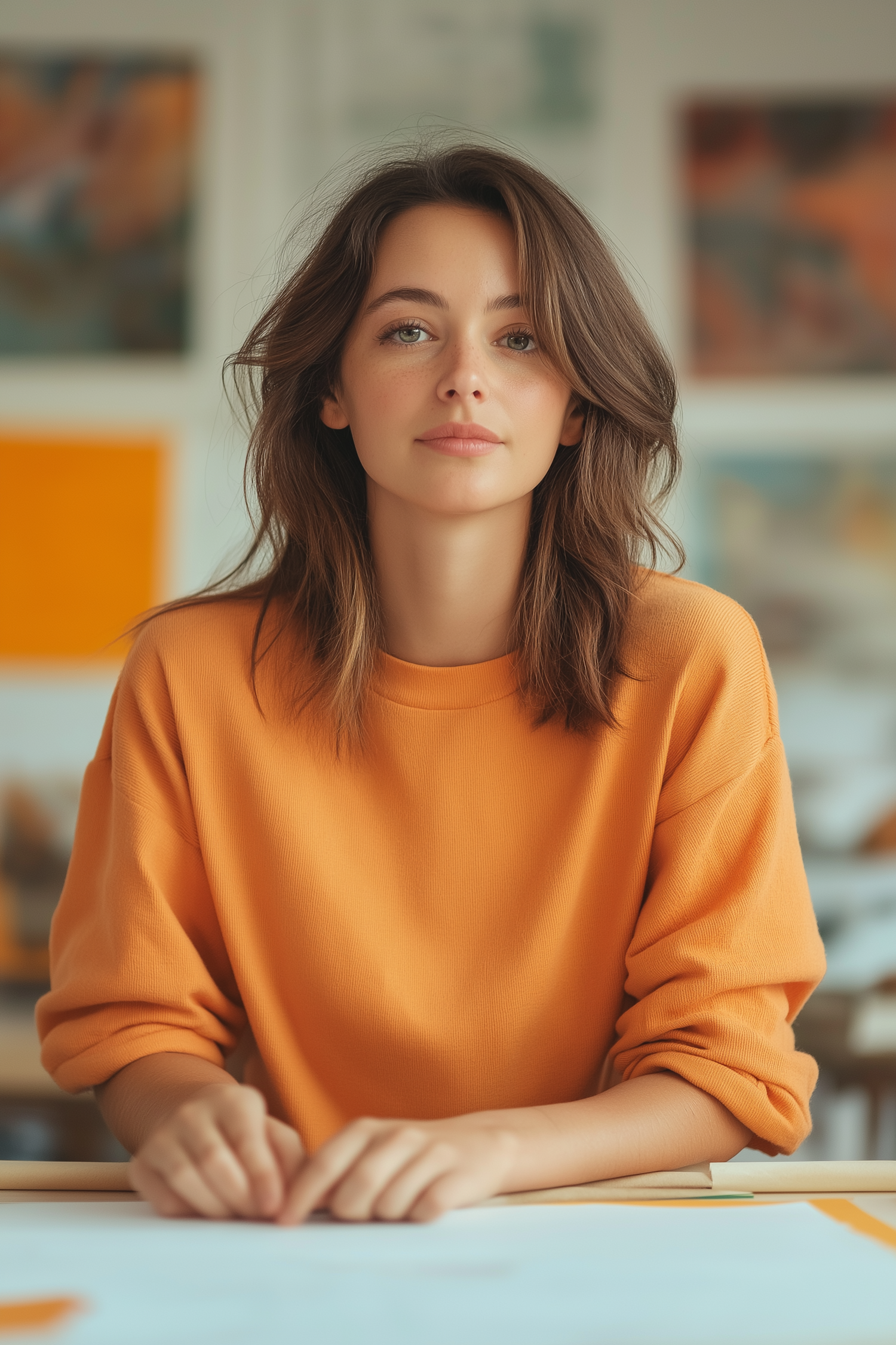 Young woman in orange sweater with brown hair and green eyes, sitting at a table with abstract art in the background.