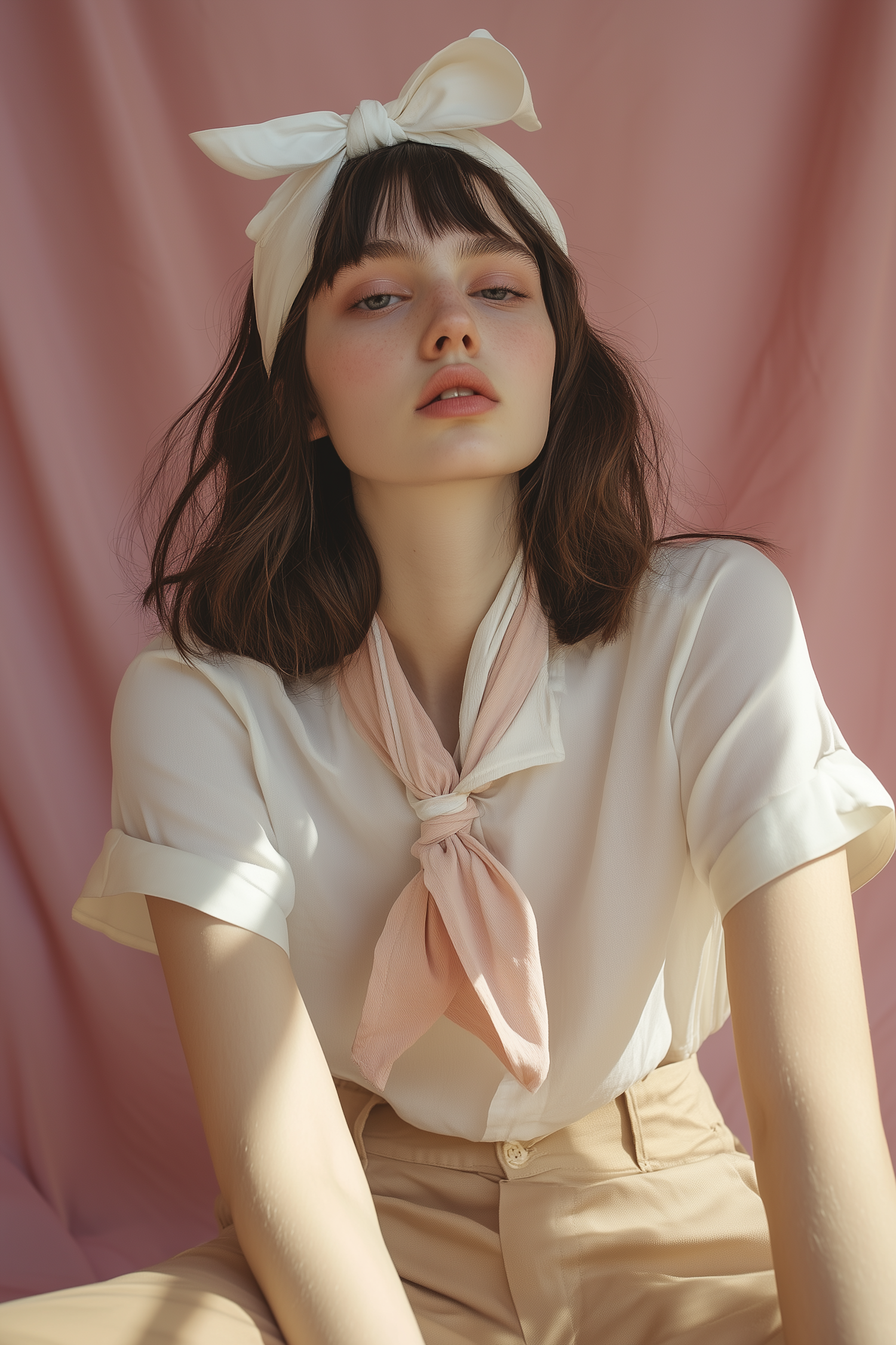 Young woman with white headband and pink scarf poses against a pink backdrop, exuding elegance and calmness.