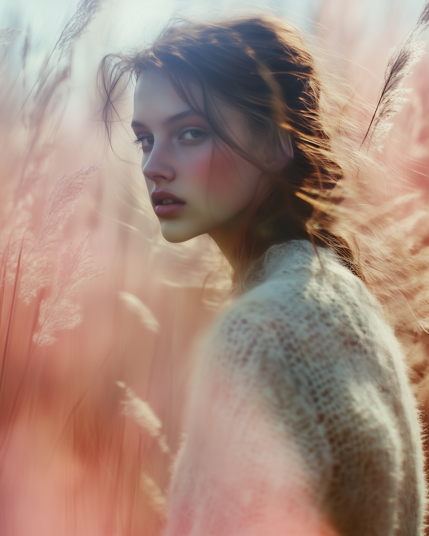Ethereal portrait of a young woman in soft light, surrounded by dreamy pink grass and wearing a cozy cream sweater.
