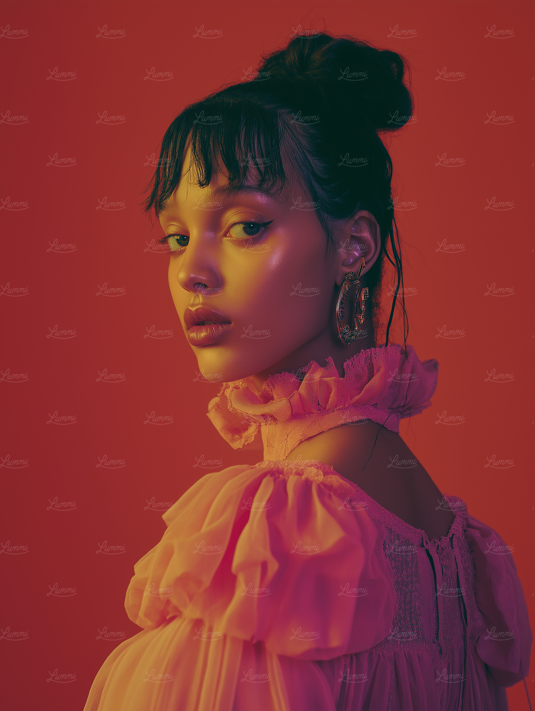 Elegant woman with dark hair in a bun, wearing a pink ruffled blouse and hoop earrings, set against a bold red background.