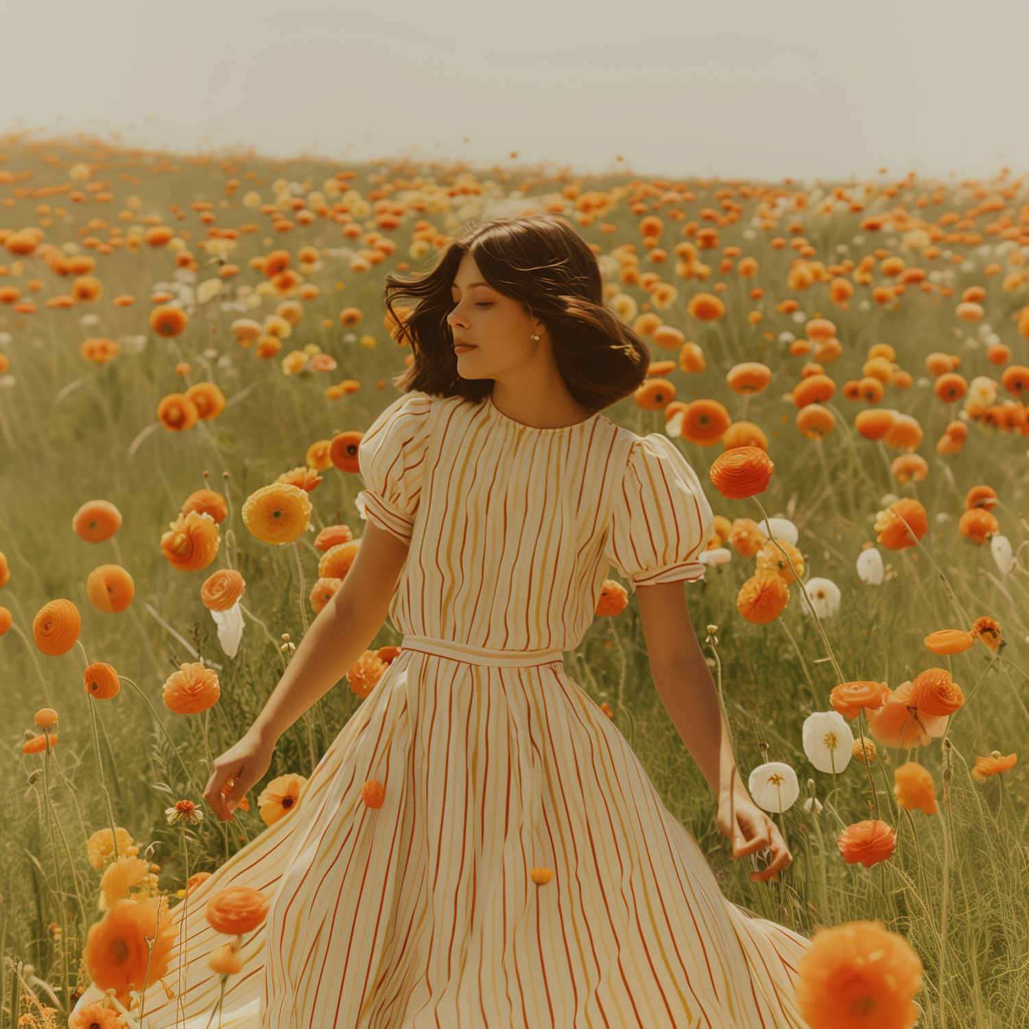 A serene woman in a striped dress stands in a vibrant field of orange and white flowers, enjoying a peaceful moment.