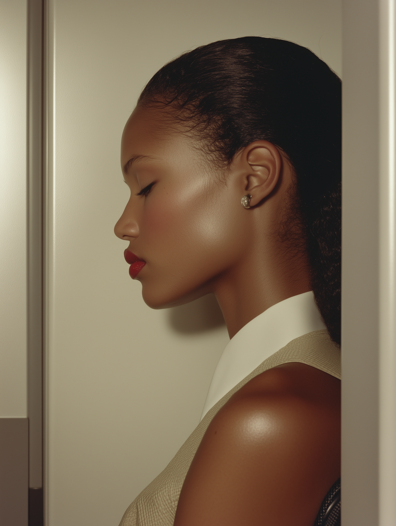 Profile of a woman with sleek hair and red lips, wearing a beige top with a white collar. Elegant and serene expression.