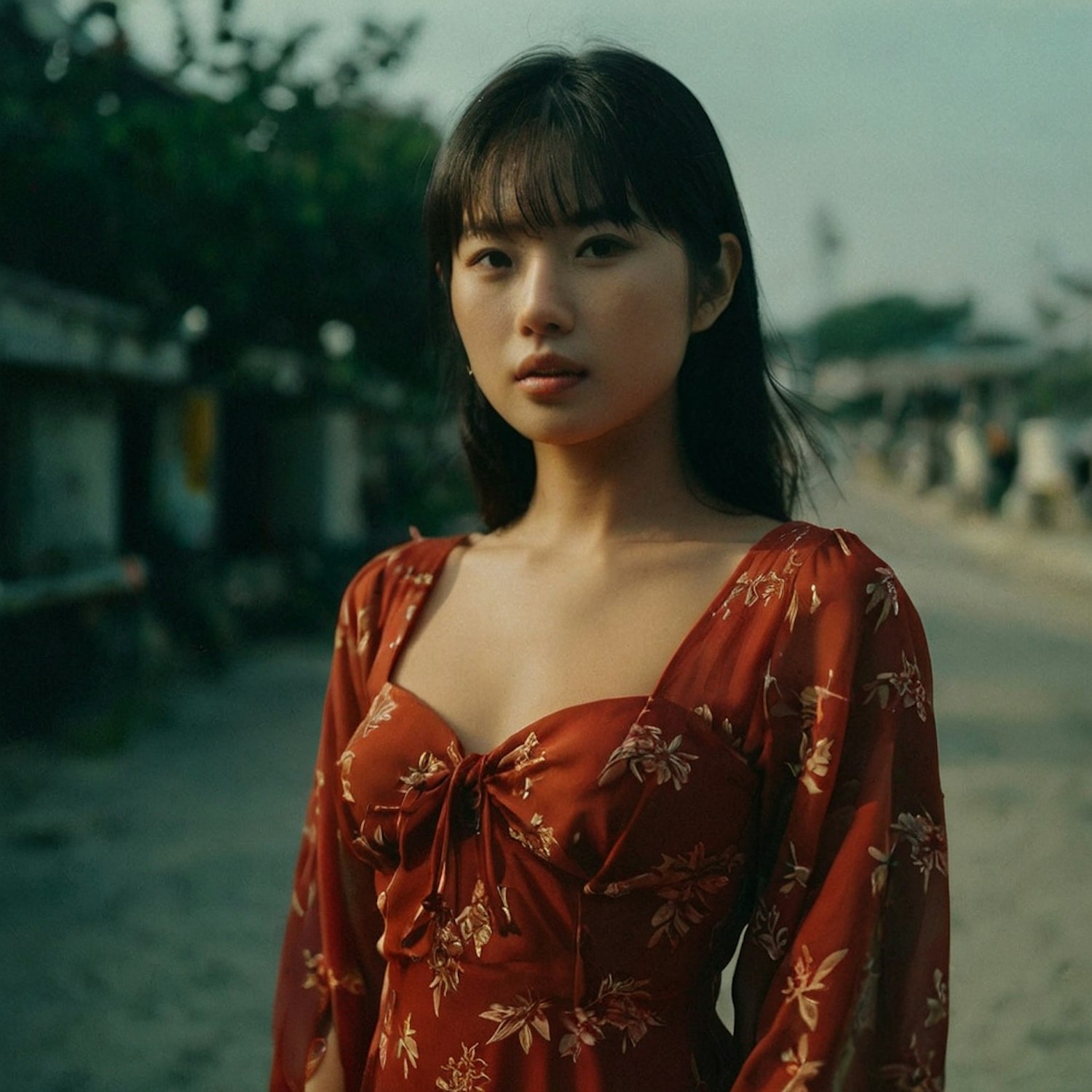 Asian woman in a red floral dress stands outdoors, exuding calmness with a serene expression and soft lighting.