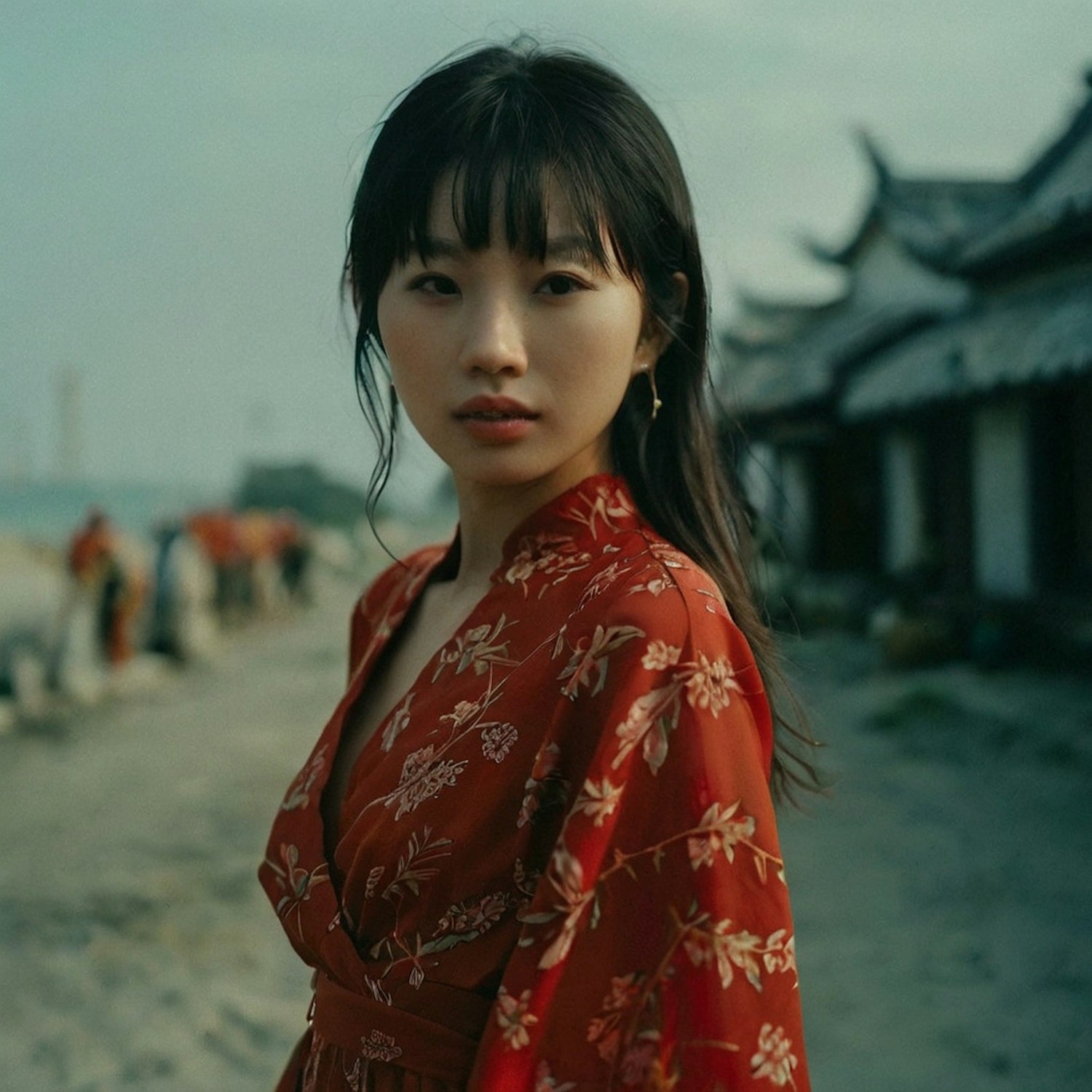 Asian woman in red floral dress stands on sandy path with traditional architecture in background, under an overcast sky.