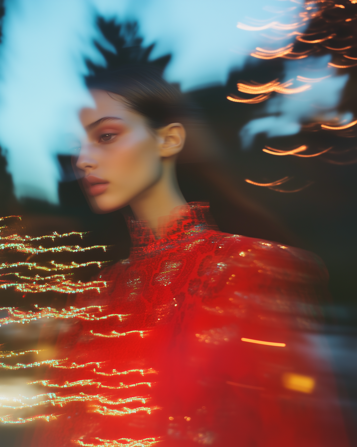 Artistic portrait of a woman in a red dress with blurred lights, creating a dreamy and ethereal atmosphere.