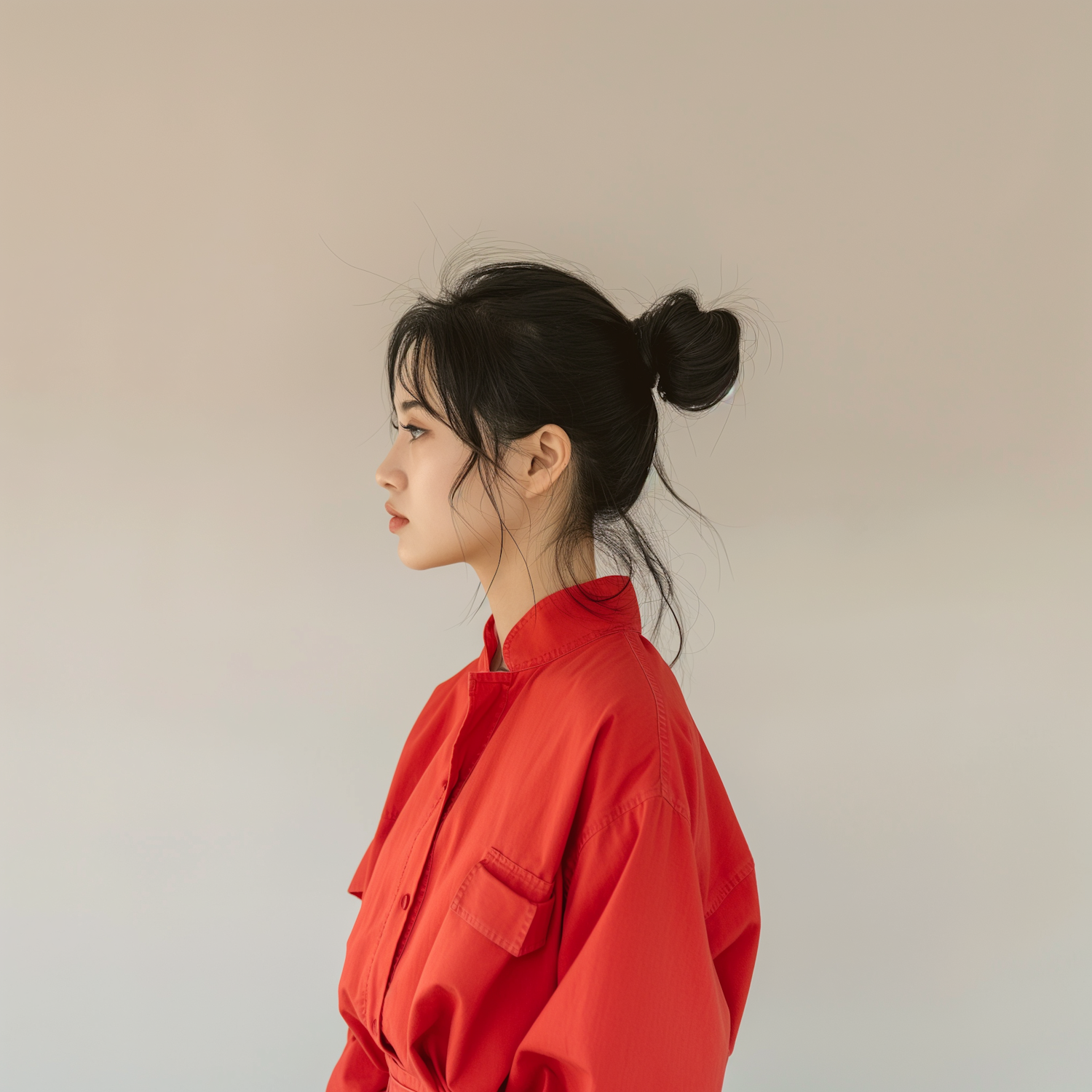 Profile of an Asian woman in a red shirt with a bun, set against a neutral background. Calm expression and soft lighting enhance the scene.