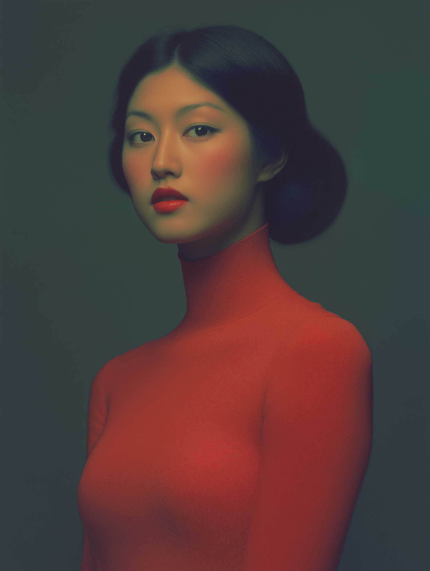 Elegant portrait of an Asian woman in a red top, with sleek hair and bold red lipstick, set against a dark background.