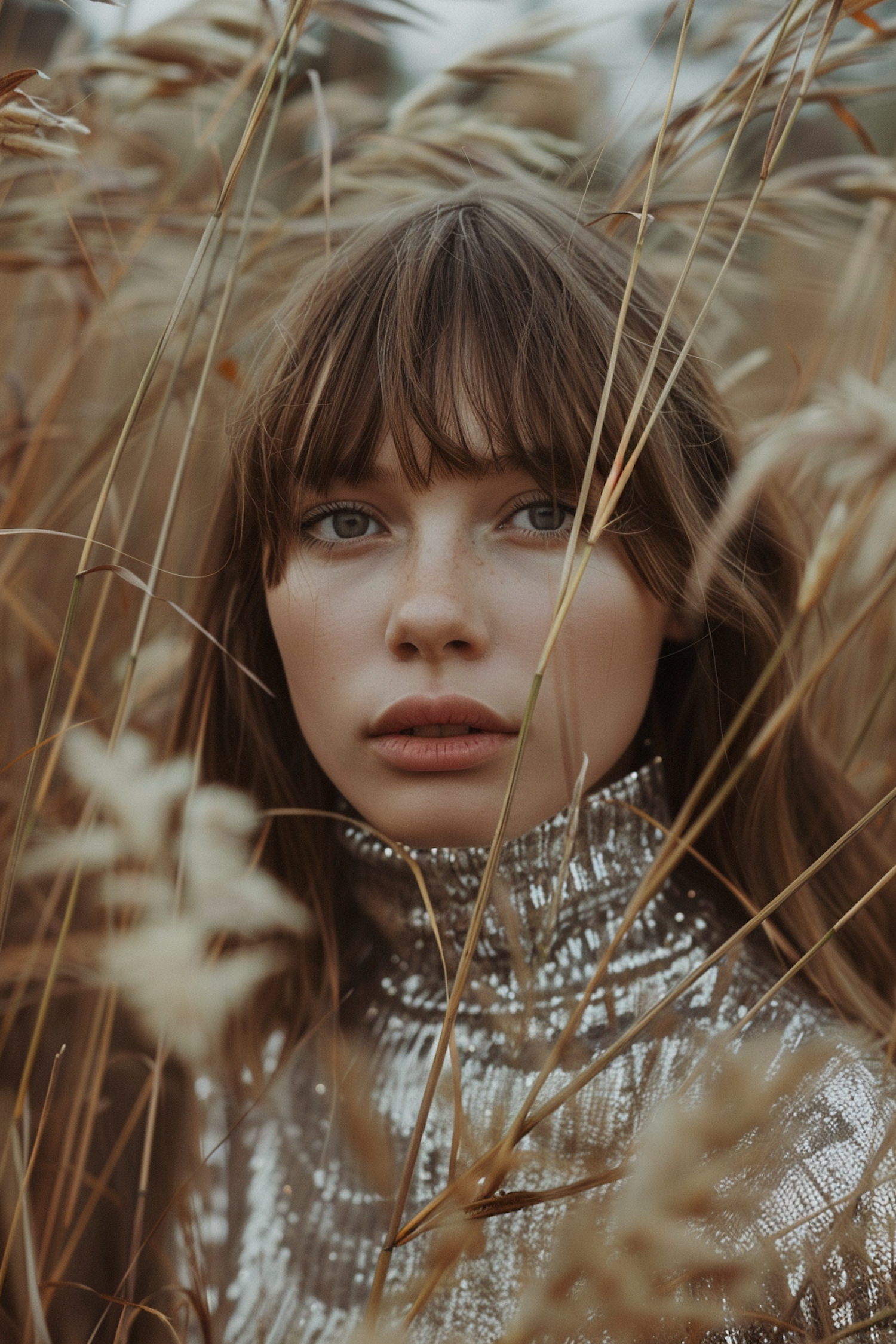 Caucasian woman with blue eyes in a silver top surrounded by golden grasses, creating a serene and elegant scene.