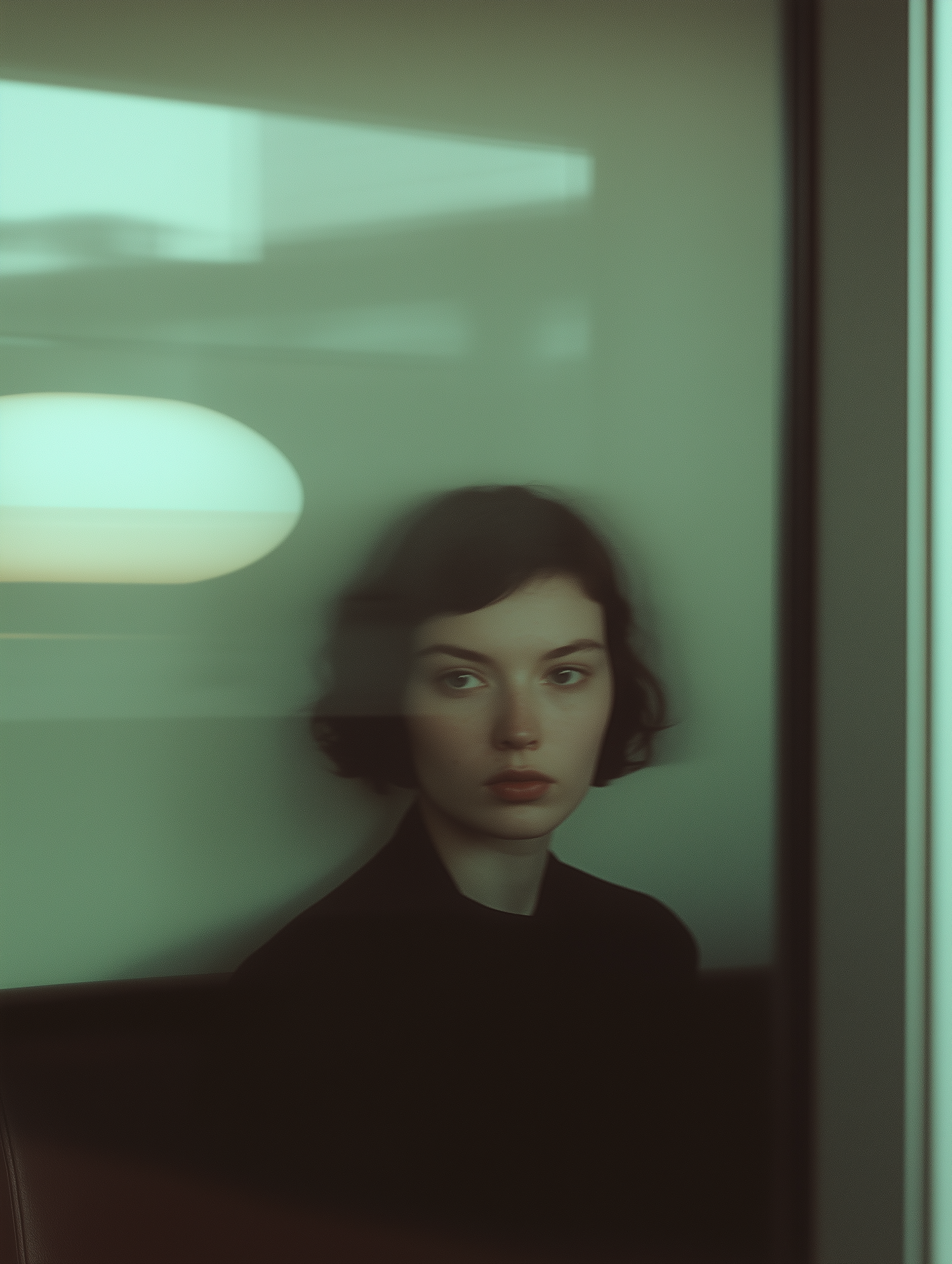 A contemplative woman with short dark hair seen through a blurred glass pane, creating a serene and mysterious atmosphere.