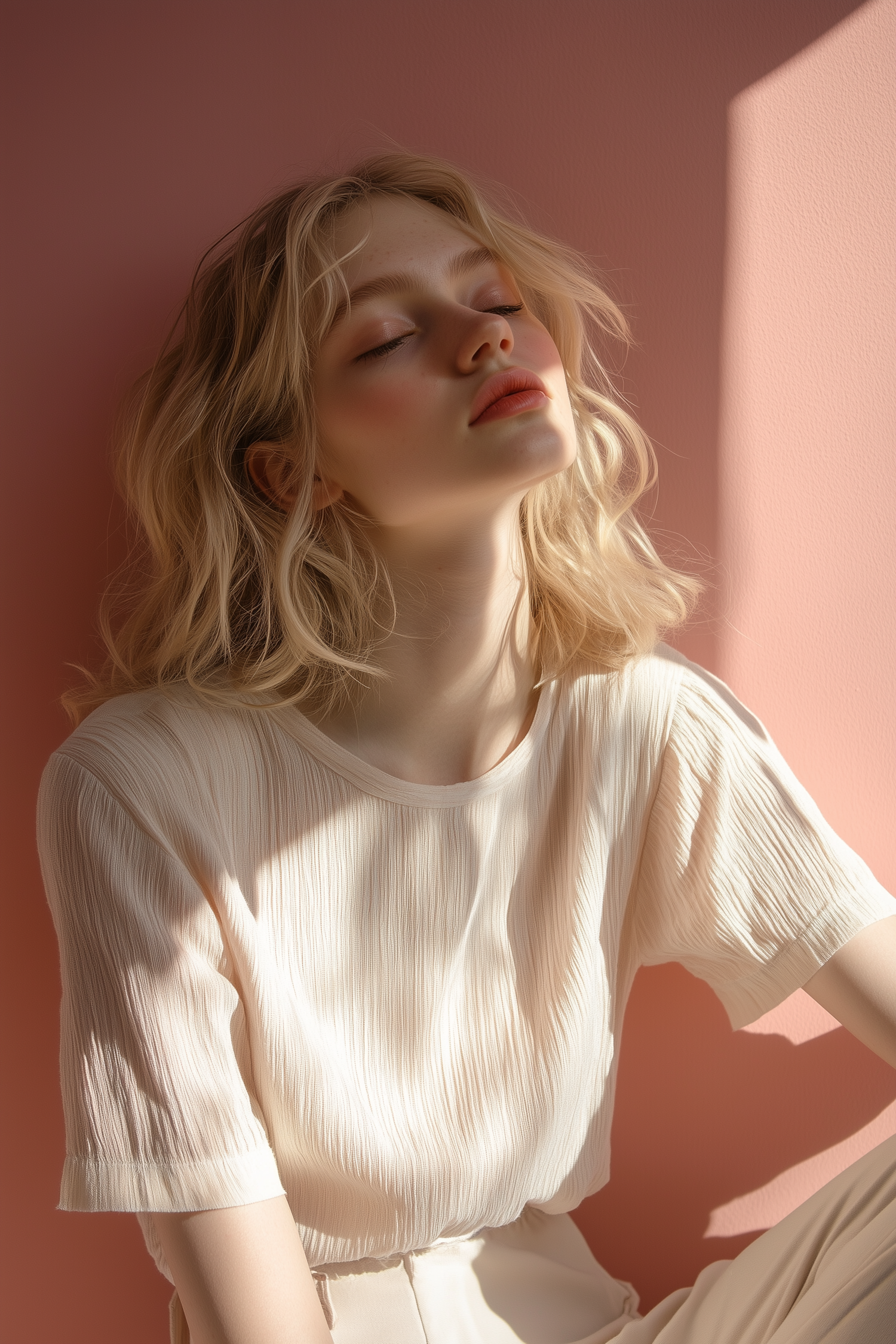 Serene portrait of a blonde woman in soft sunlight against a pink background, exuding calm and natural beauty.
