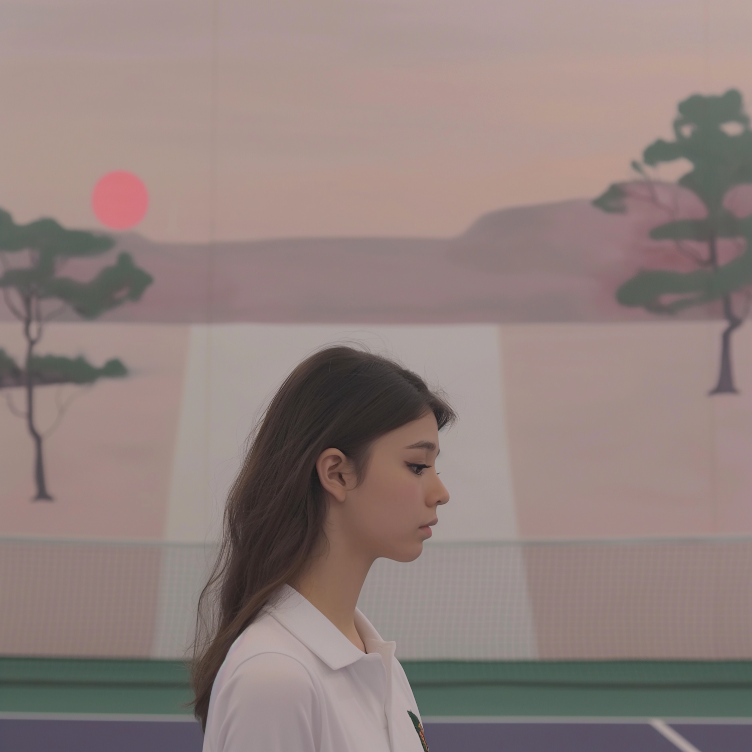 Profile of a young woman against a serene painted landscape with a pink sky and trees, evoking tranquility and introspection.