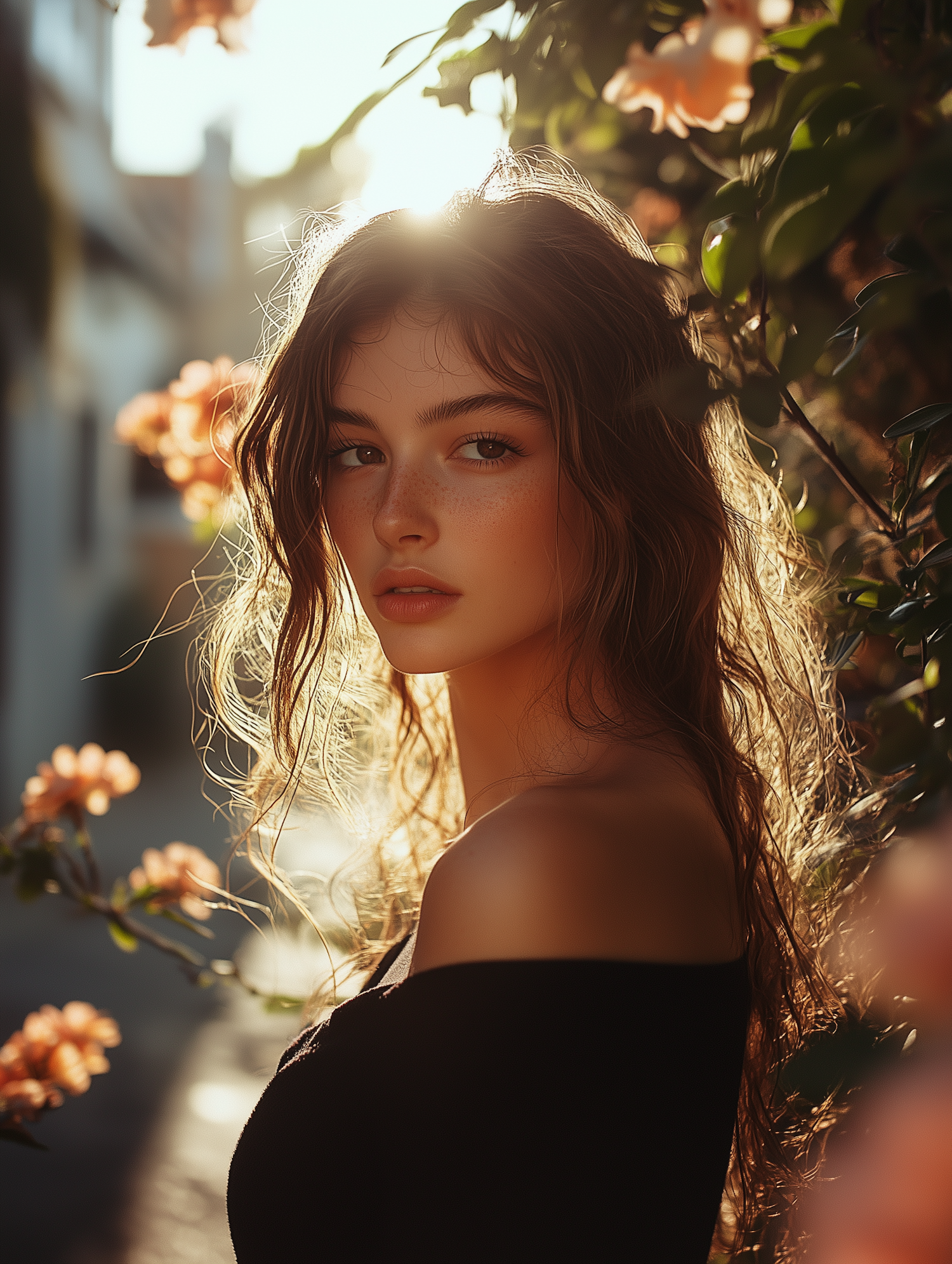 A serene young woman with wavy brown hair in sunlight, surrounded by blooming flowers, wearing a black off-shoulder top.
