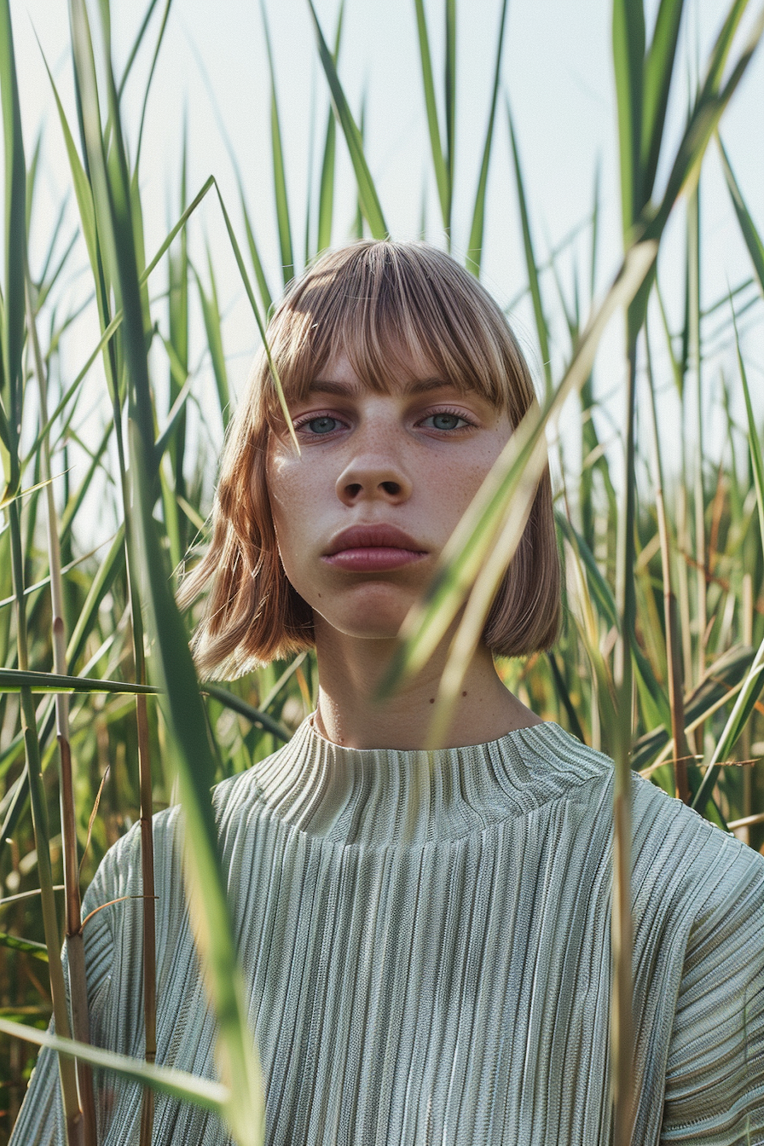 Young woman with blonde hair in a green sweater stands among tall reeds, creating a serene and natural atmosphere.