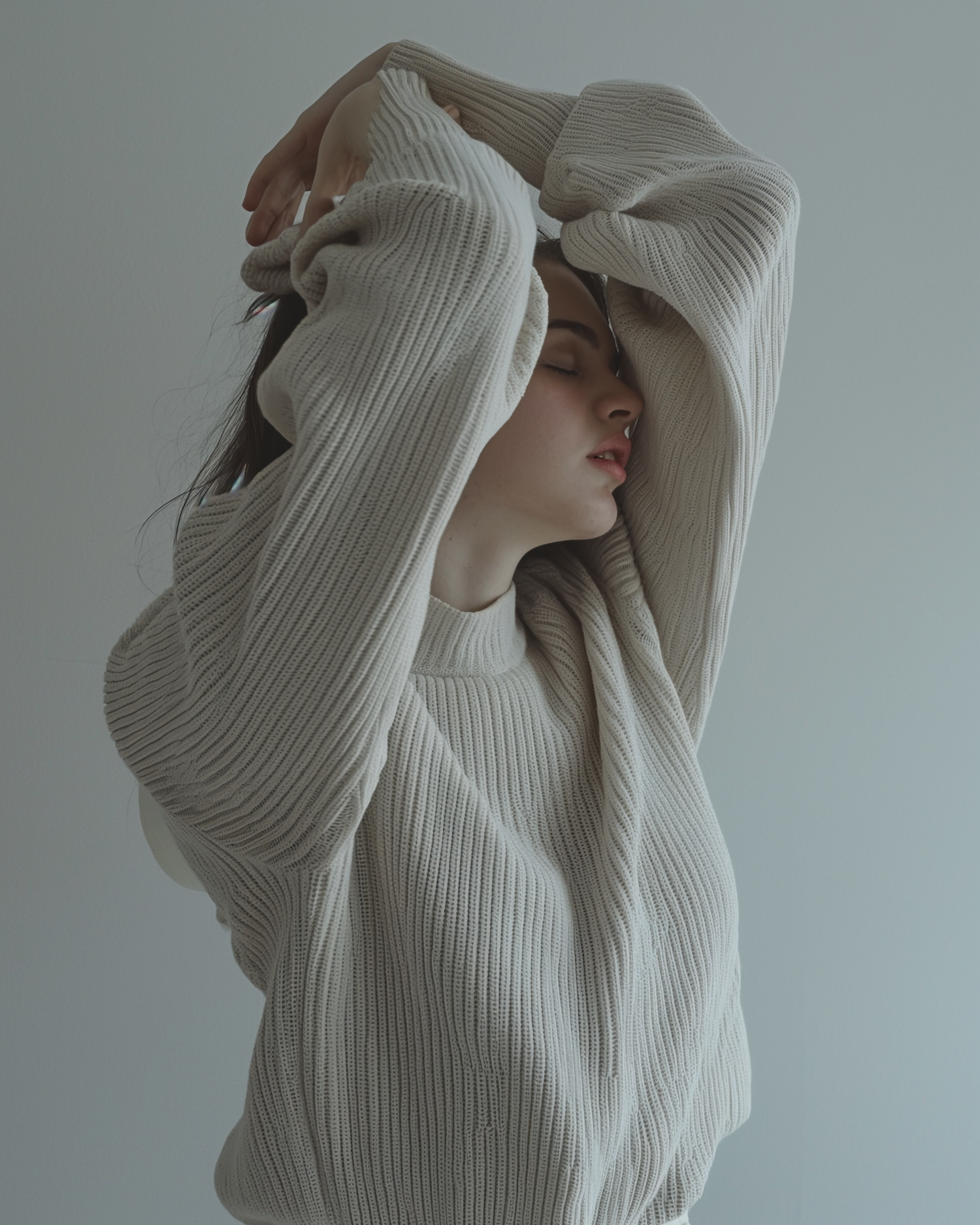 A serene portrait of a woman in a cream ribbed sweater, eyes closed, arms gracefully raised against a soft gray background.