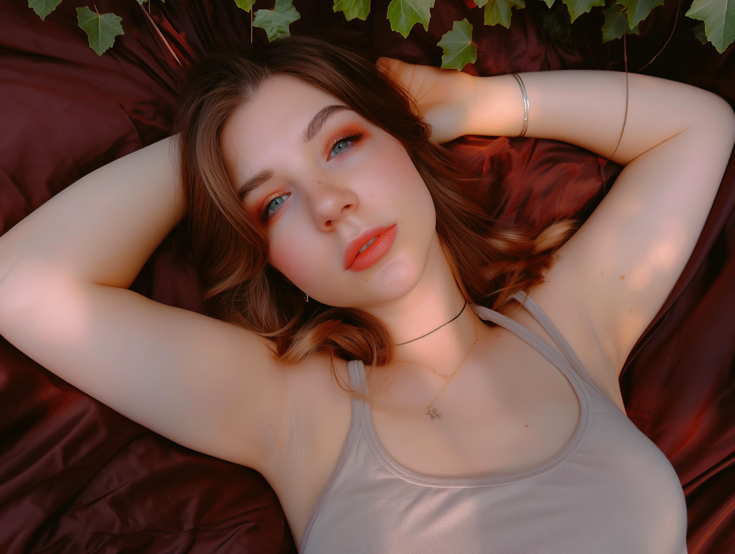 Young woman with blue eyes and brown hair lying on burgundy fabric, surrounded by ivy leaves, wearing a gray tank top and necklace.
