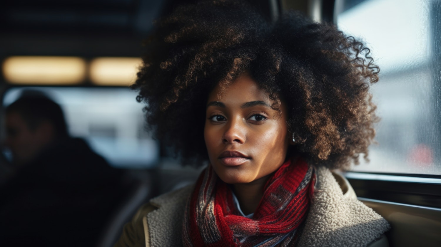 Young woman with curly hair and red scarf sitting by a window, exuding calm and elegance in a public setting.