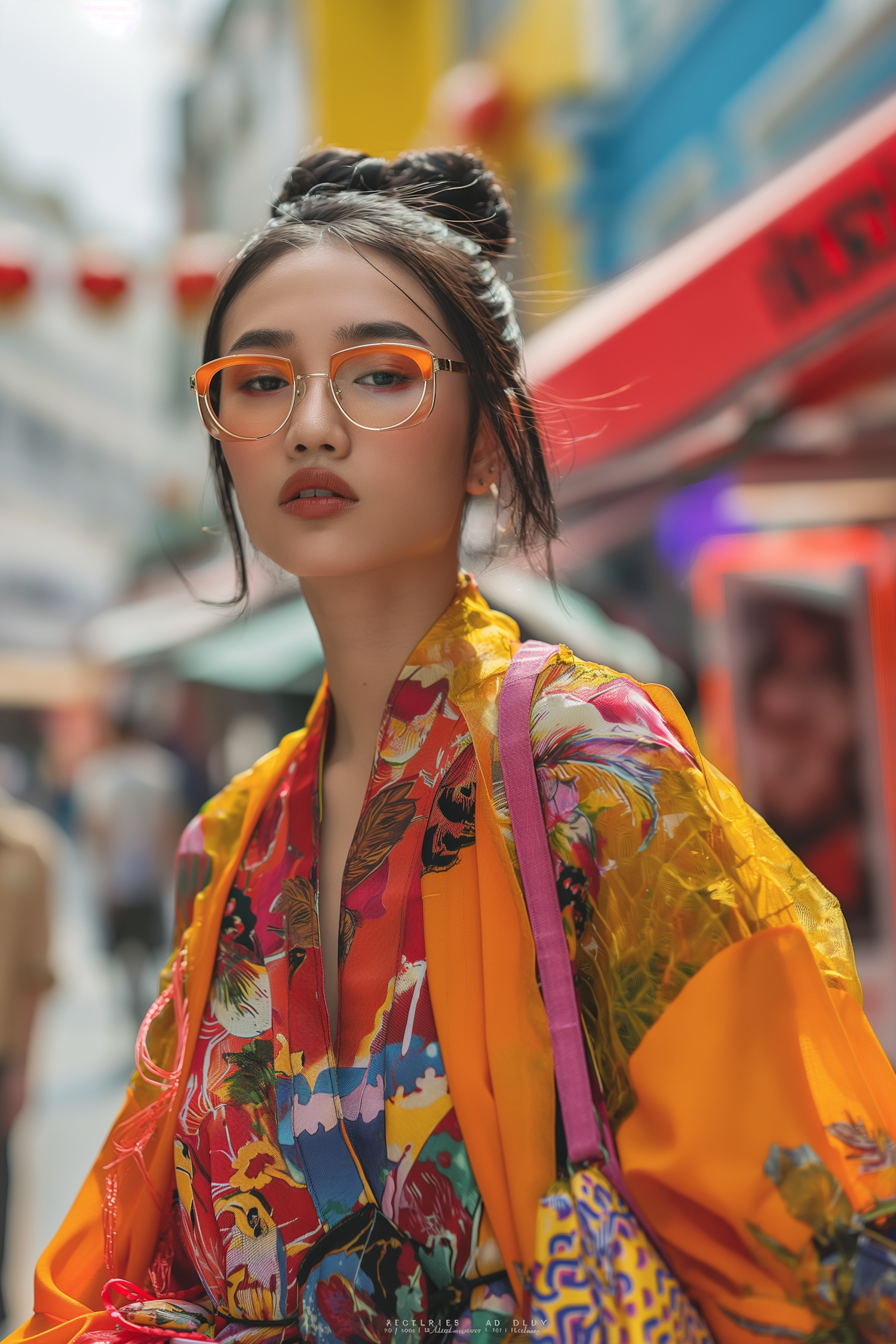 Stylish Asian woman in vibrant attire and orange glasses, set against a colorful urban street backdrop.