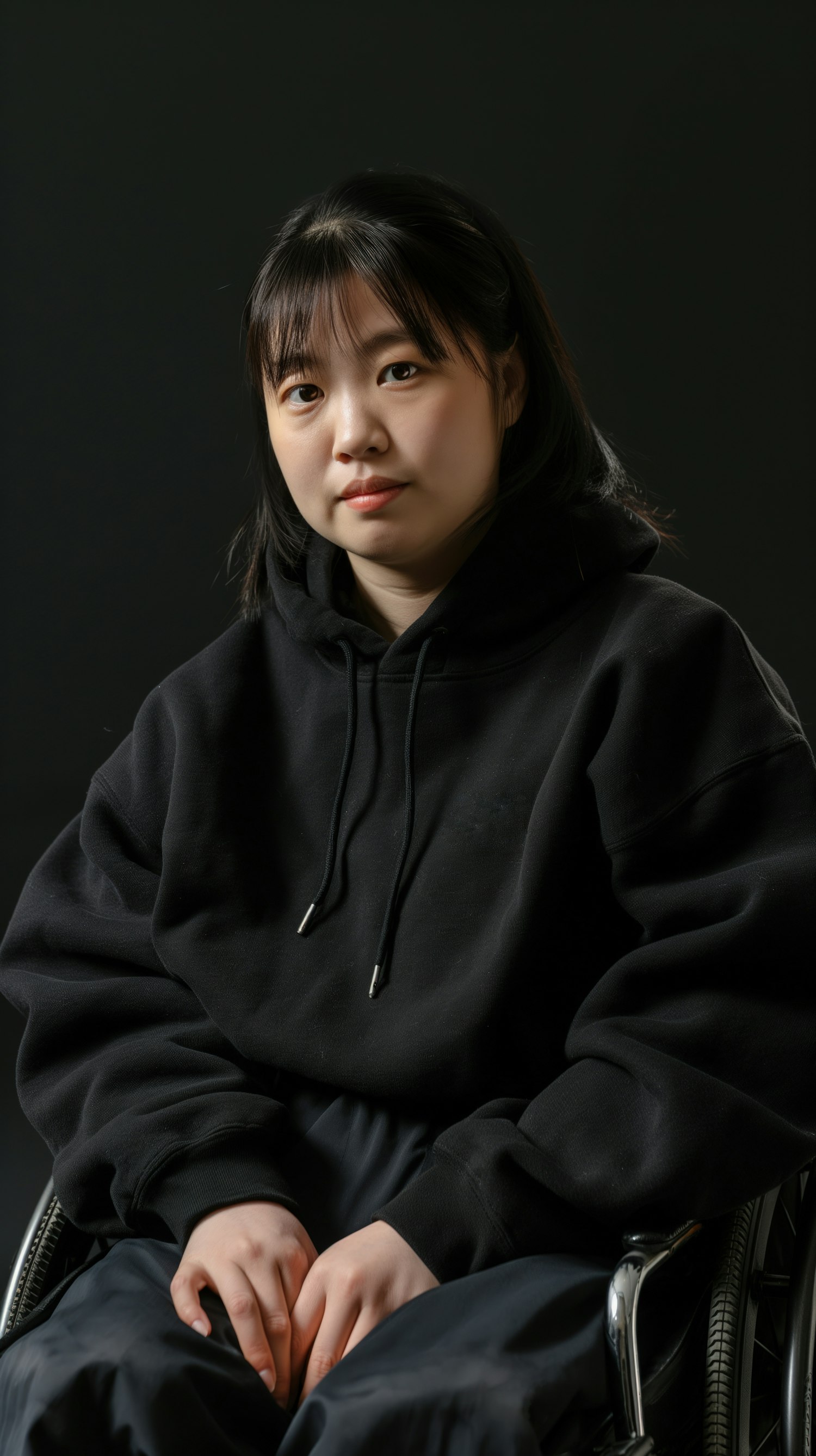Asian woman in a black hoodie sitting in a wheelchair, calm expression, dark background, soft lighting.