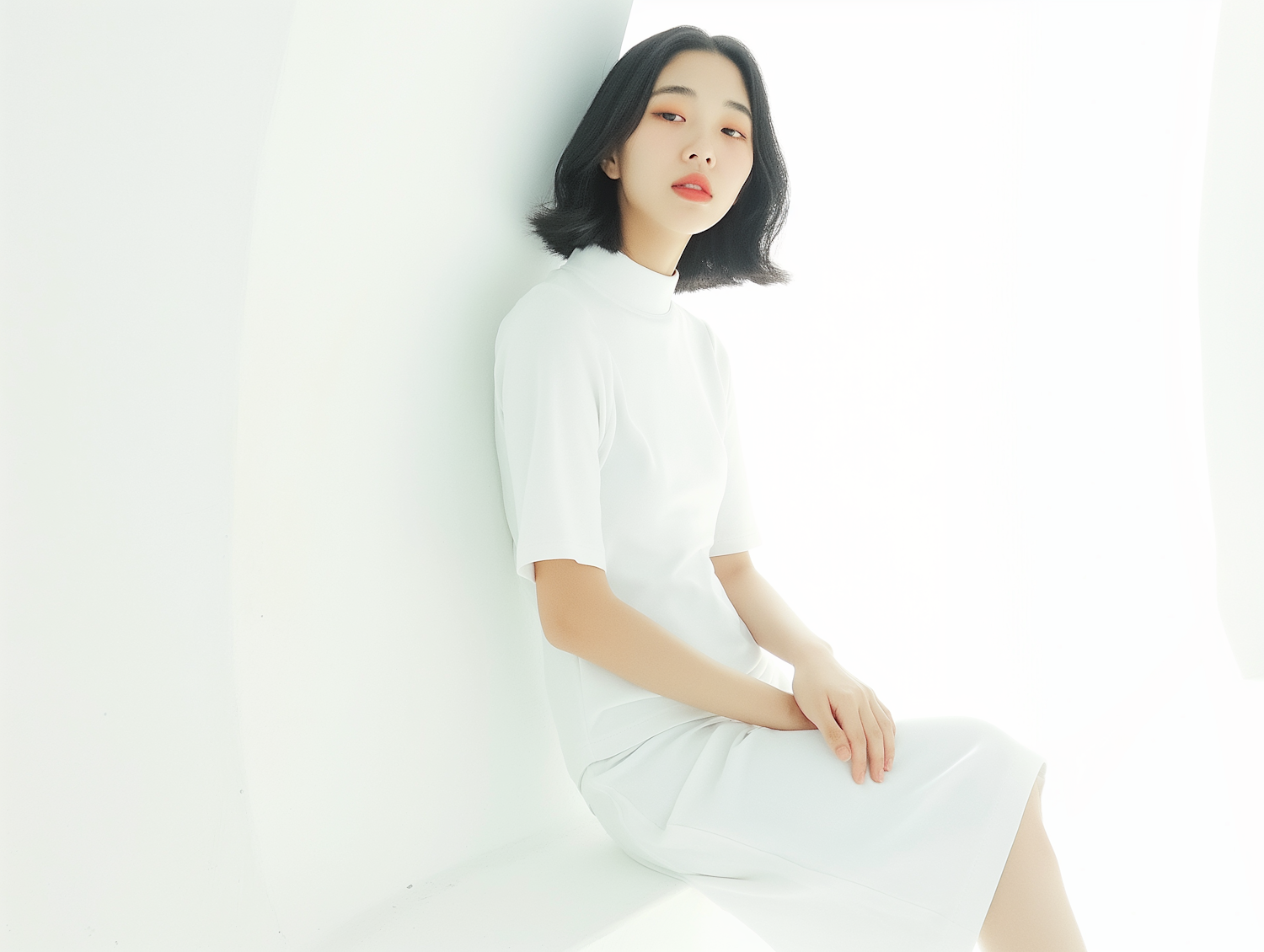Asian woman in a white dress sitting against a bright, minimalist background, exuding elegance and serenity.