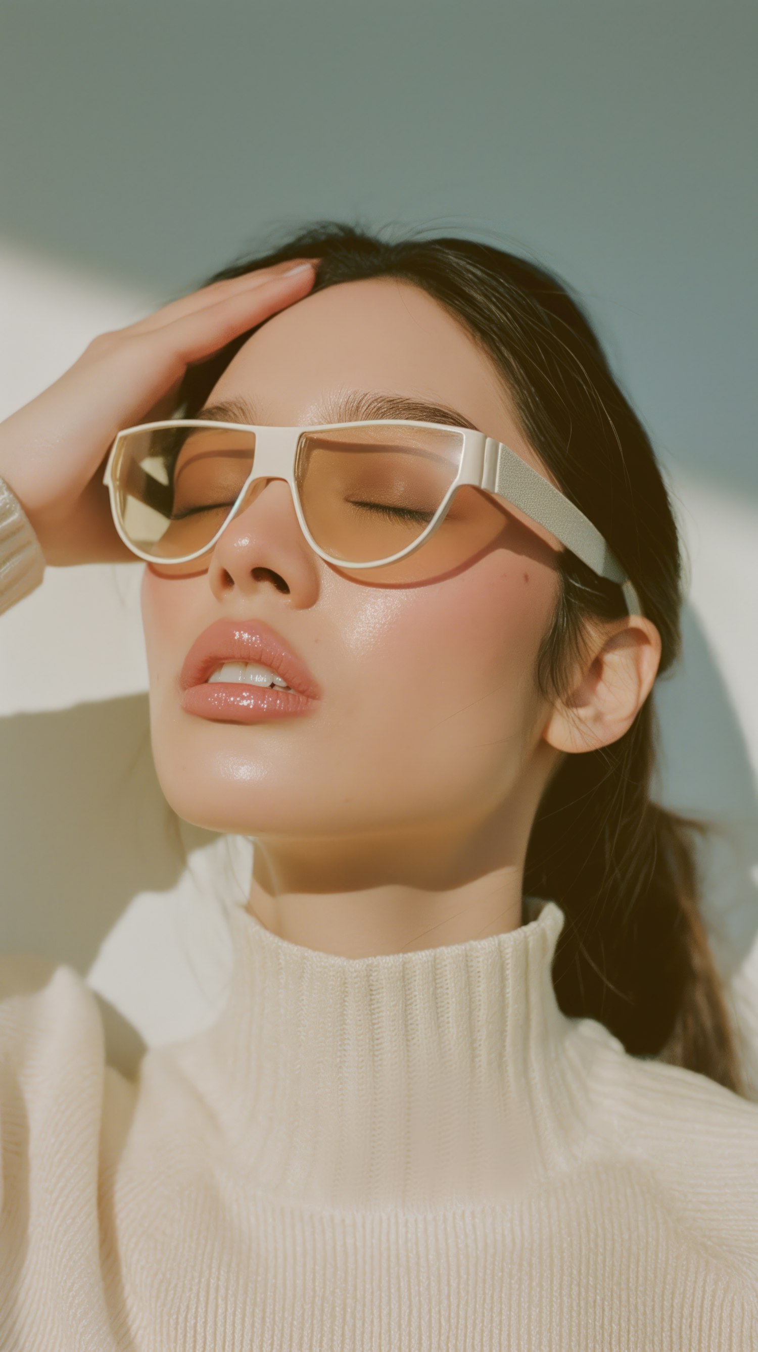 Stylish woman in oversized sunglasses and cream sweater, exuding elegance and serenity with a soft, muted background.