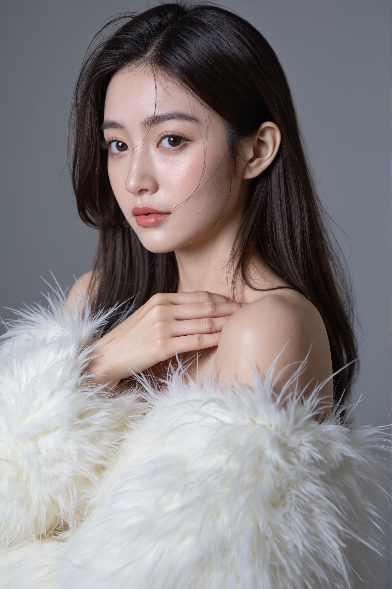 Elegant portrait of a woman in white faux fur, showcasing natural beauty and sophistication with a serene expression.