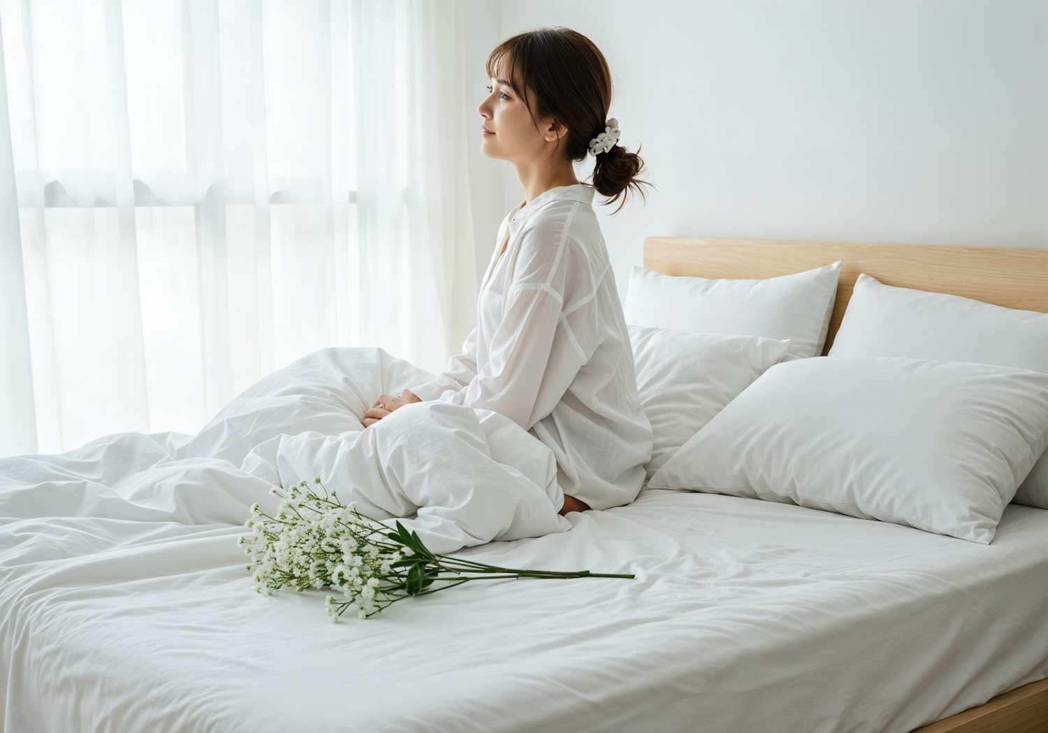 Asian woman in white attire sitting on a bed with flowers, gazing out a window in a bright, serene room.