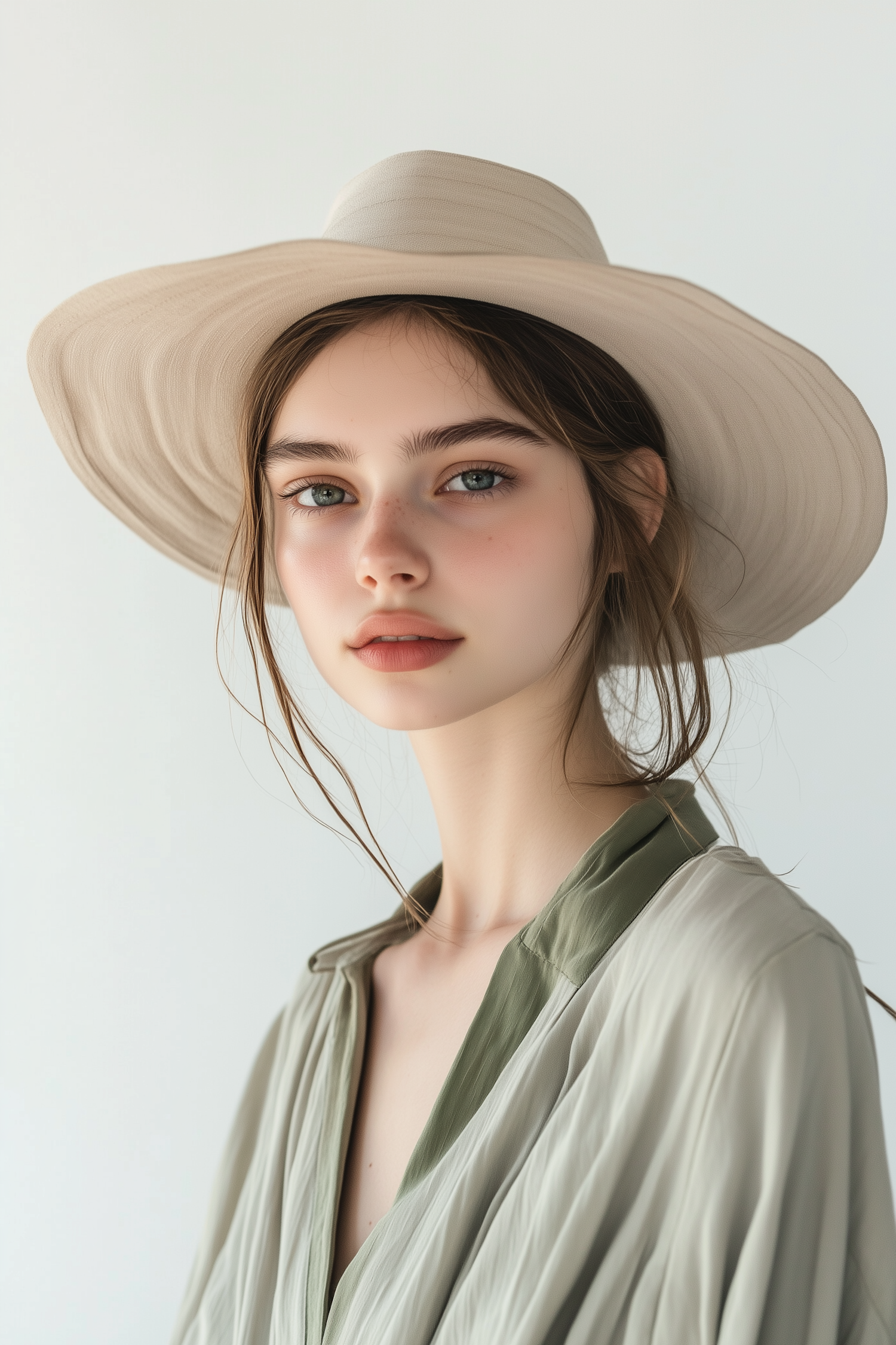 Elegant woman in a wide-brimmed hat and flowing green blouse, with a blurred face, exuding a soft and sophisticated style.