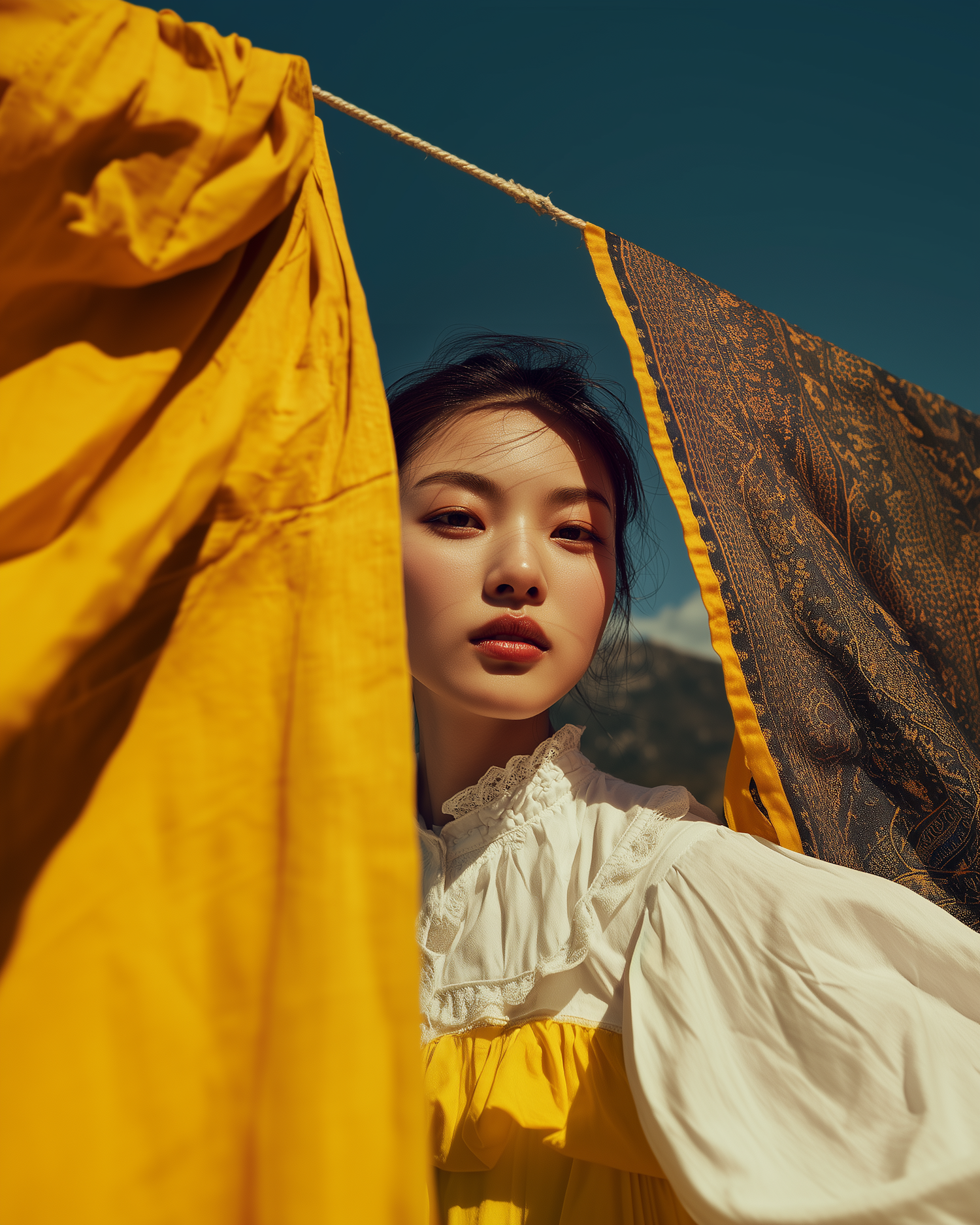 A serene portrait of a woman framed by yellow fabric under a clear blue sky, blending soft sunlight and vibrant colors.
