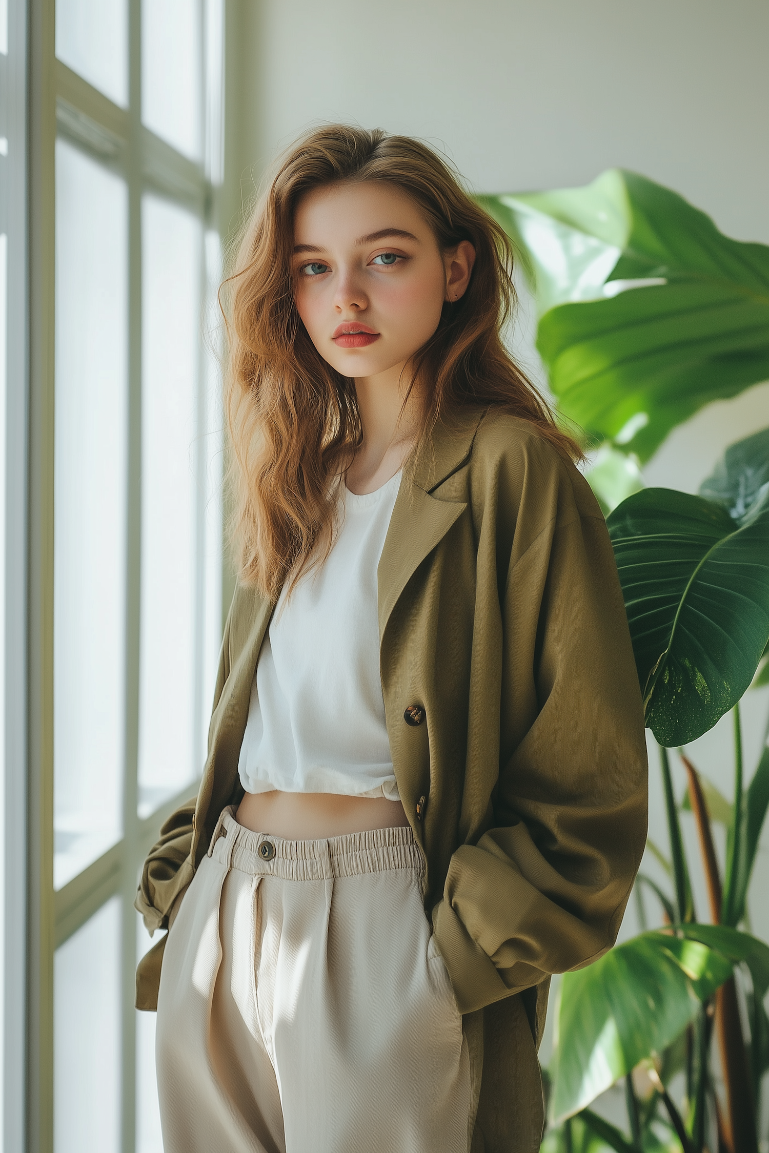 Young woman in olive jacket and beige pants by a window, with natural light and a green plant in the background.