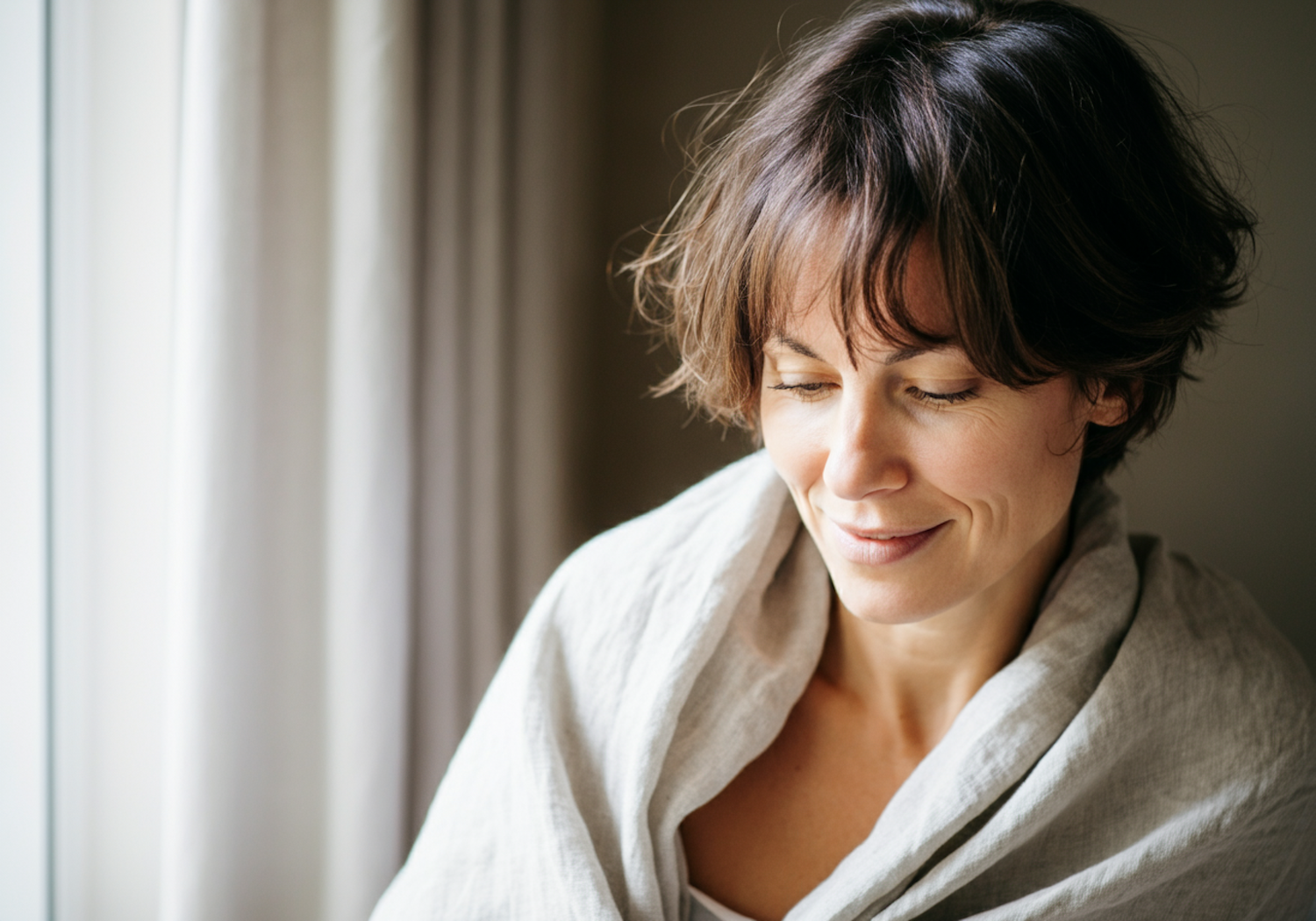 A serene portrait of a woman with short brown hair, softly smiling and wrapped in a light fabric, illuminated by natural light.