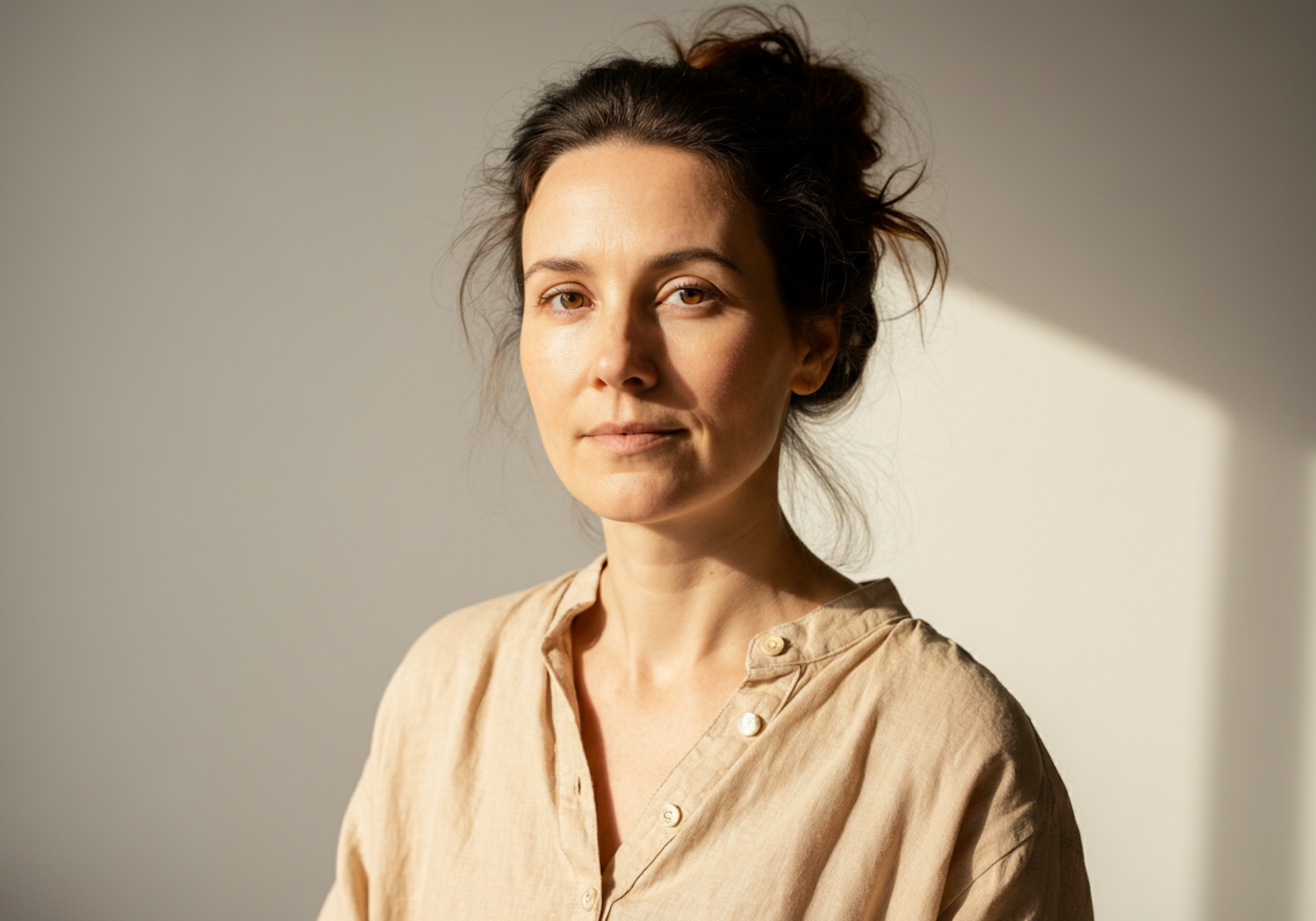 A woman with a messy bun and beige shirt looks calm in soft natural light against a plain background.