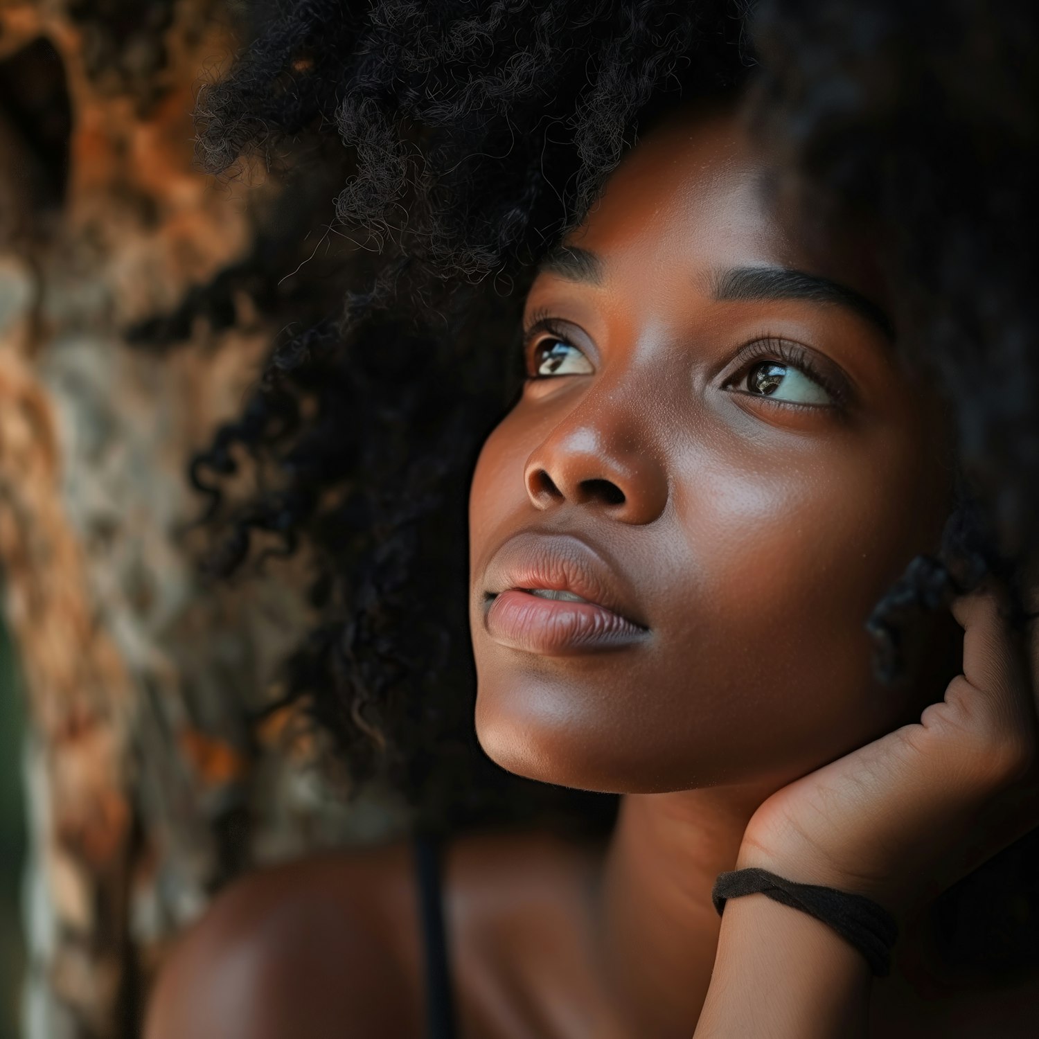 Close-up portrait of a contemplative Black woman with natural curly hair, gazing upwards in a serene outdoor setting.