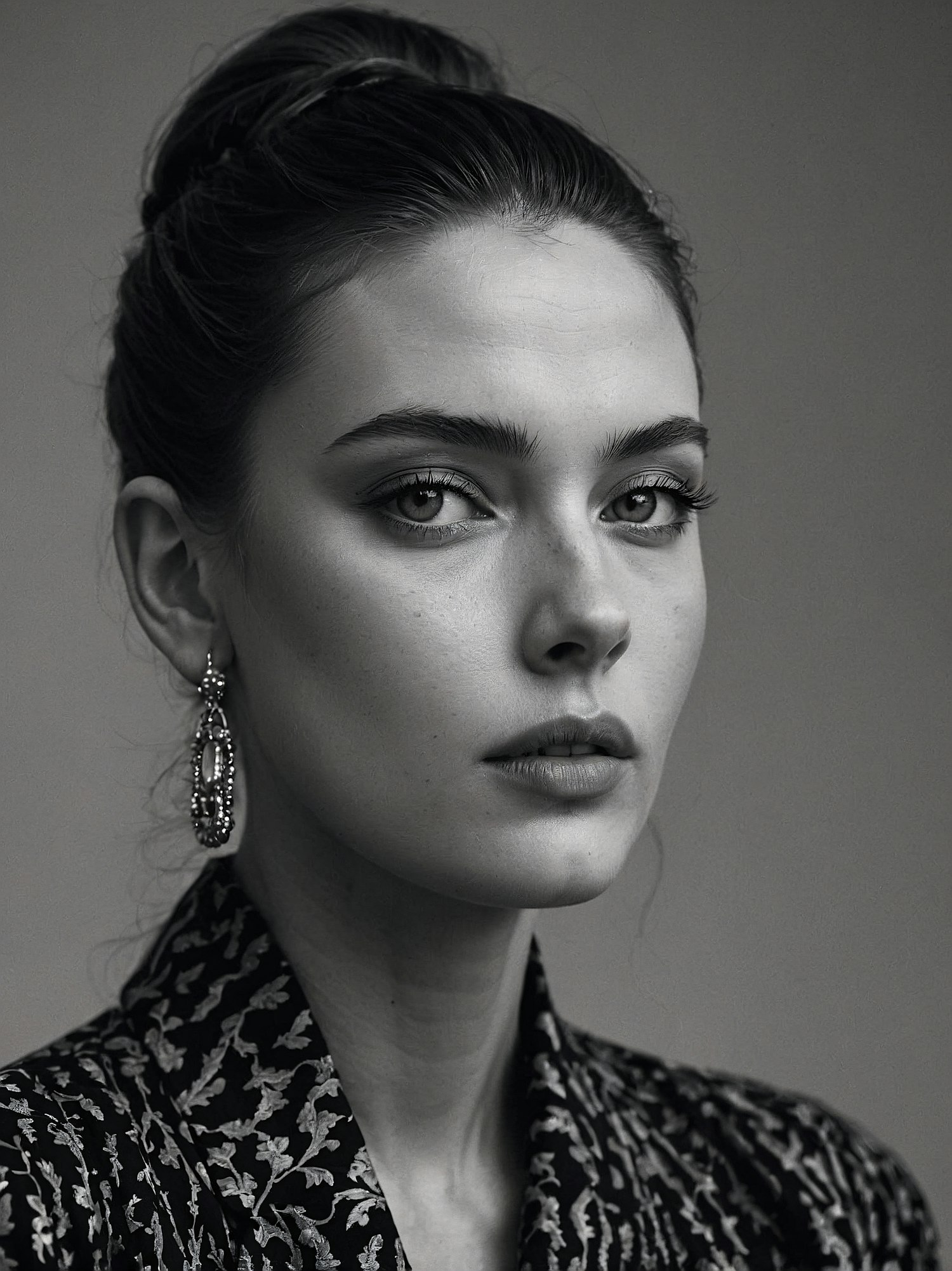 Elegant black and white portrait of a woman with an updo and intricate earrings, exuding timeless beauty and grace.