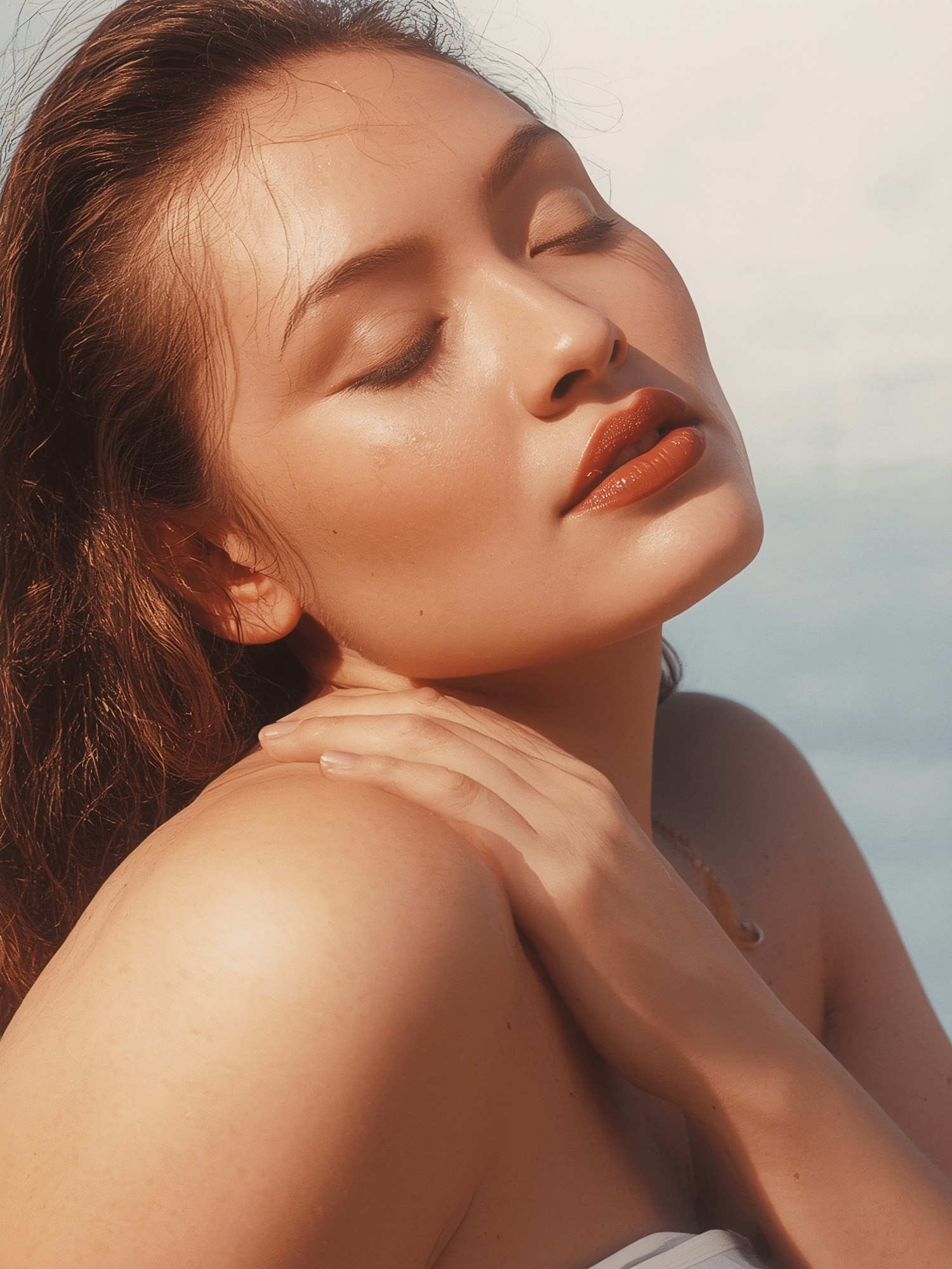 A serene close-up portrait of a woman with glowing skin, closed eyes, and a peaceful expression, set against a soft outdoor background.