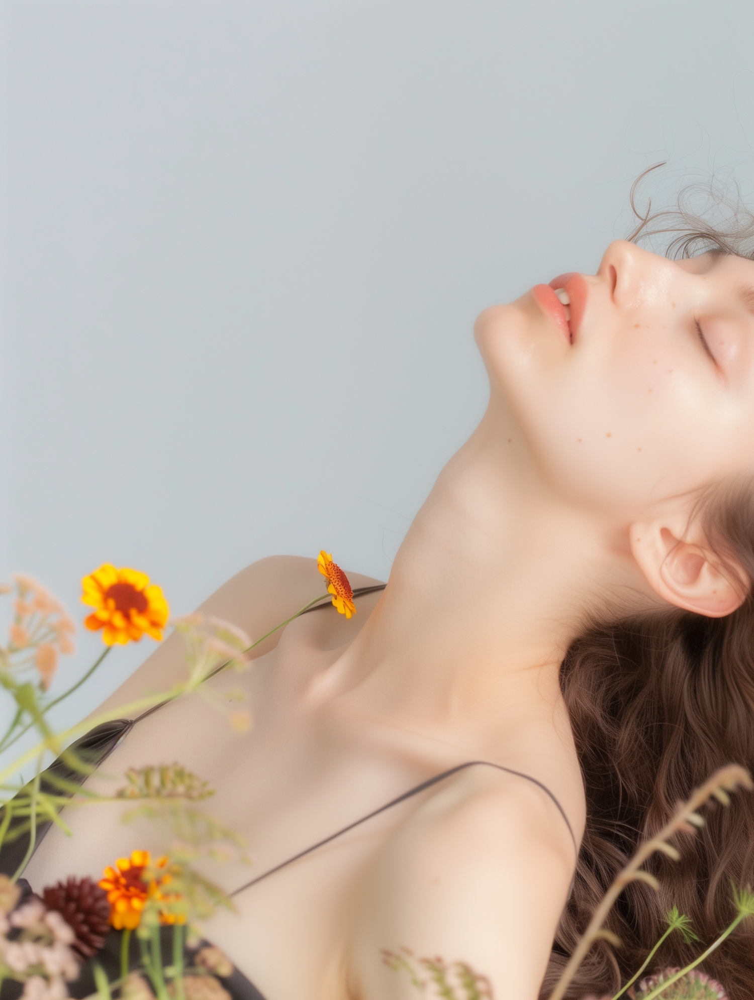 A serene portrait of a woman with wavy brown hair, surrounded by vibrant flowers, set against a soft gray-blue background.