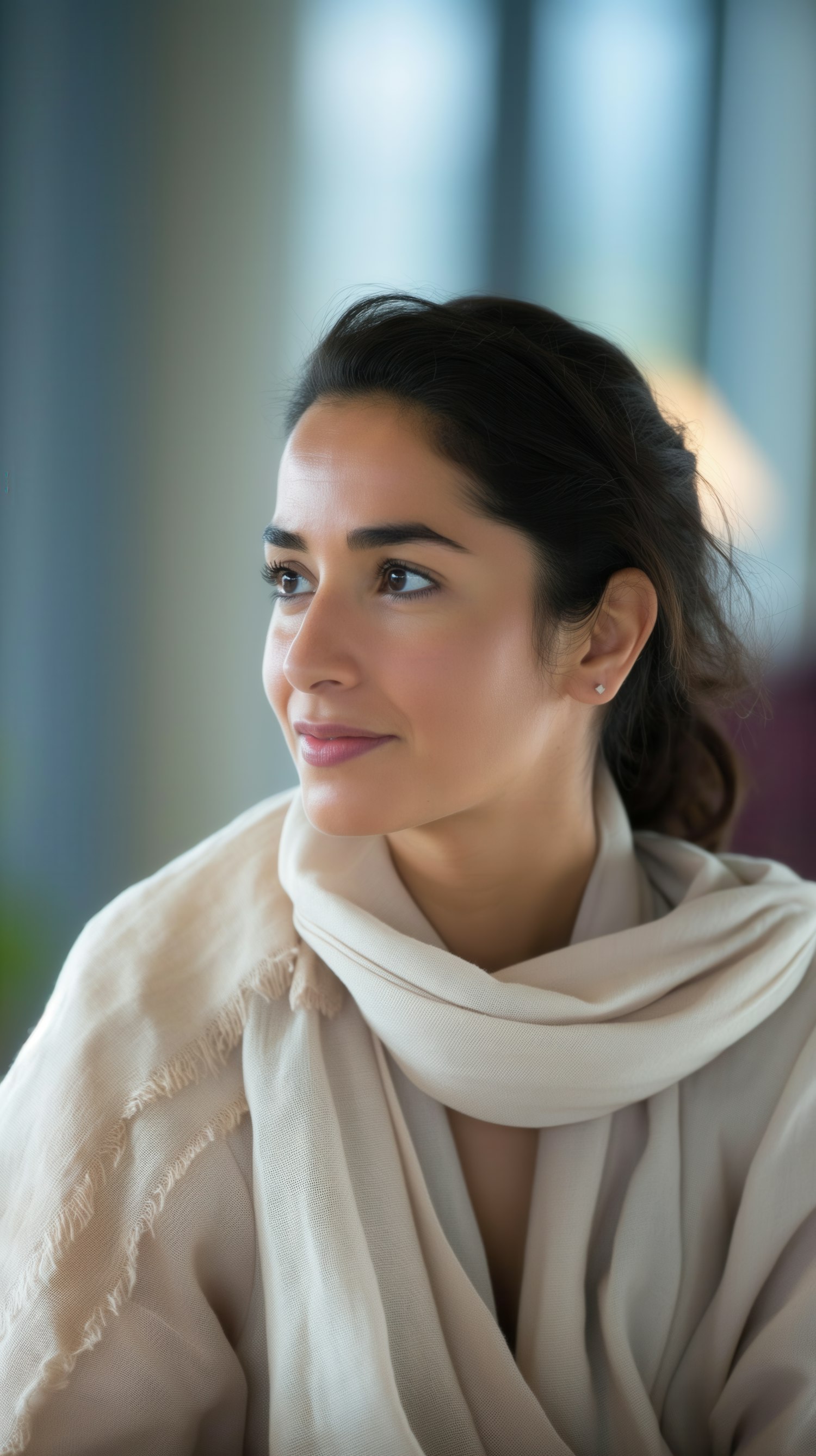 A serene woman with dark hair and a beige scarf gazes thoughtfully to the side, set against a softly blurred background.