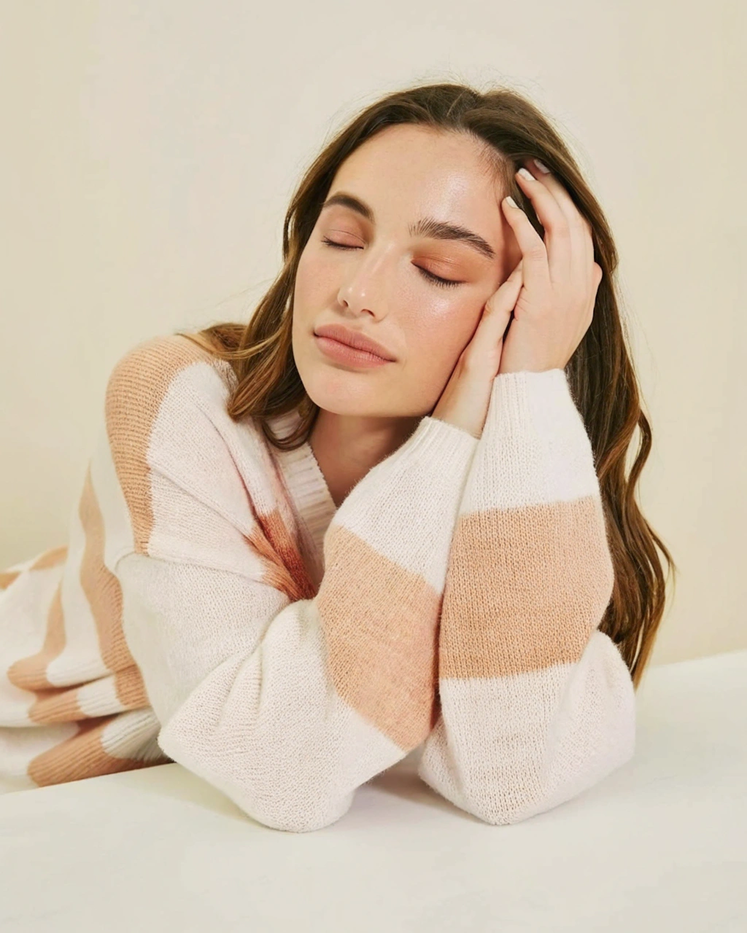 A serene moment of a woman resting her head on her hands, wearing a peach and cream striped sweater against a beige background.