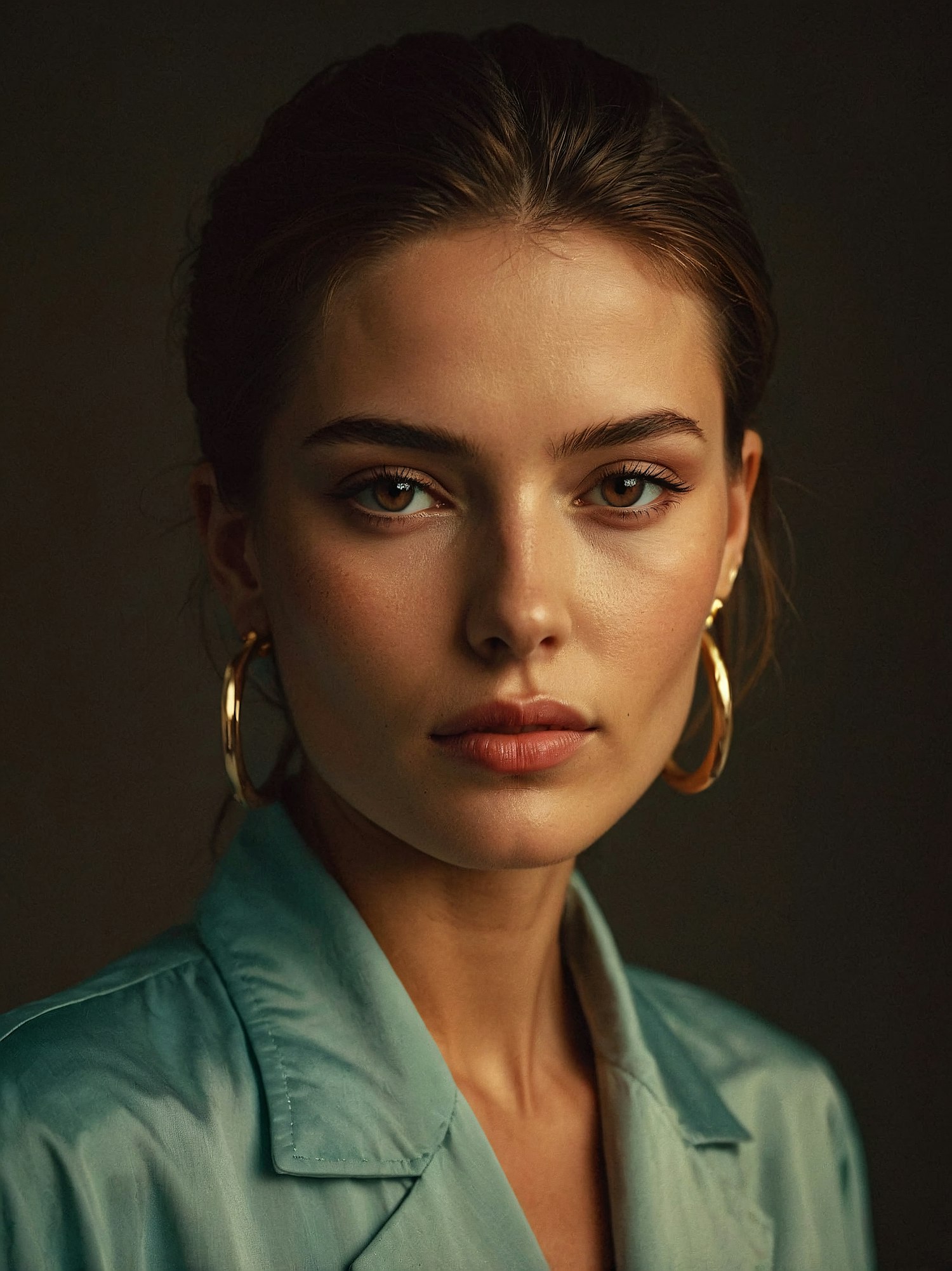 Close-up portrait of a young woman with hazel eyes, gold hoop earrings, and a teal blouse against a dark background.