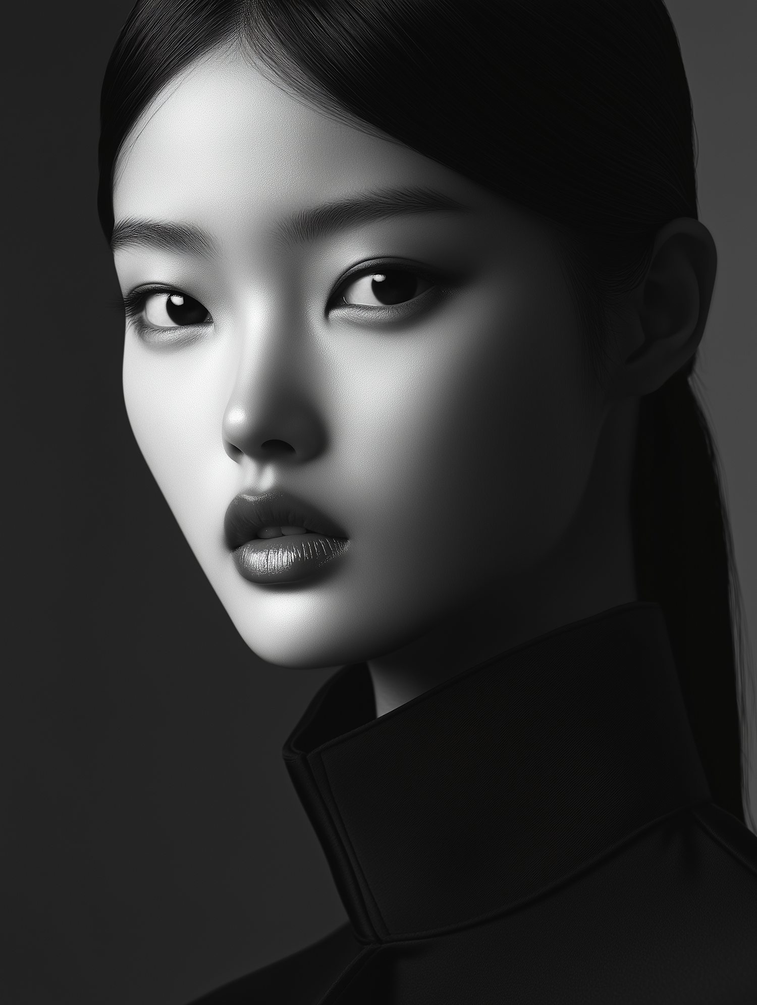 Elegant black-and-white portrait of an Asian woman with intense eyes, flawless skin, and a modern high-collared outfit.