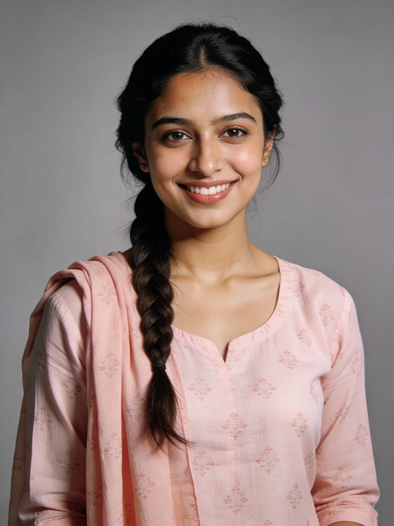 Studio portrait of an Indian female in her late 20s; medium brown skin, warm undertone; long dark hair in a low braid over one shoulder; wearing an everyday cotton salwar kameez in soft pastel pink with a simple print, dupatta draped loosely over one shoulder, no logos; neutral mid-gray seamless backdrop; Rembrandt lighting with soft fill; 105 mm macro-sharp. Expression: gentle and approachable, warm smile showing teeth. Framing: portrait orientation, 3:4 ratio; mid-chest-up composition. Subject centered in frame, camera at eye level, facing directly toward the camera (front view). Full head and braid completely inside the frame with a little space above; both shoulders and dupatta visible, no cropping at the top or sides. Neutral studio composition, no props.