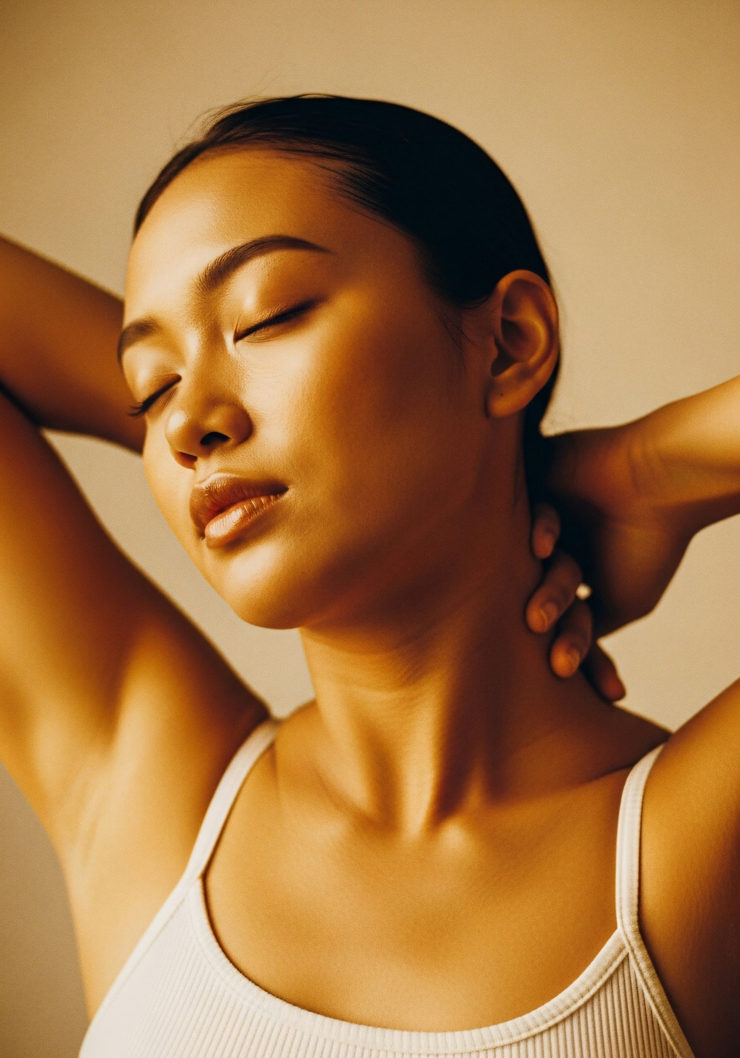 A serene portrait of a woman with closed eyes, warm lighting, and a relaxed pose, evoking a sense of calm and introspection.