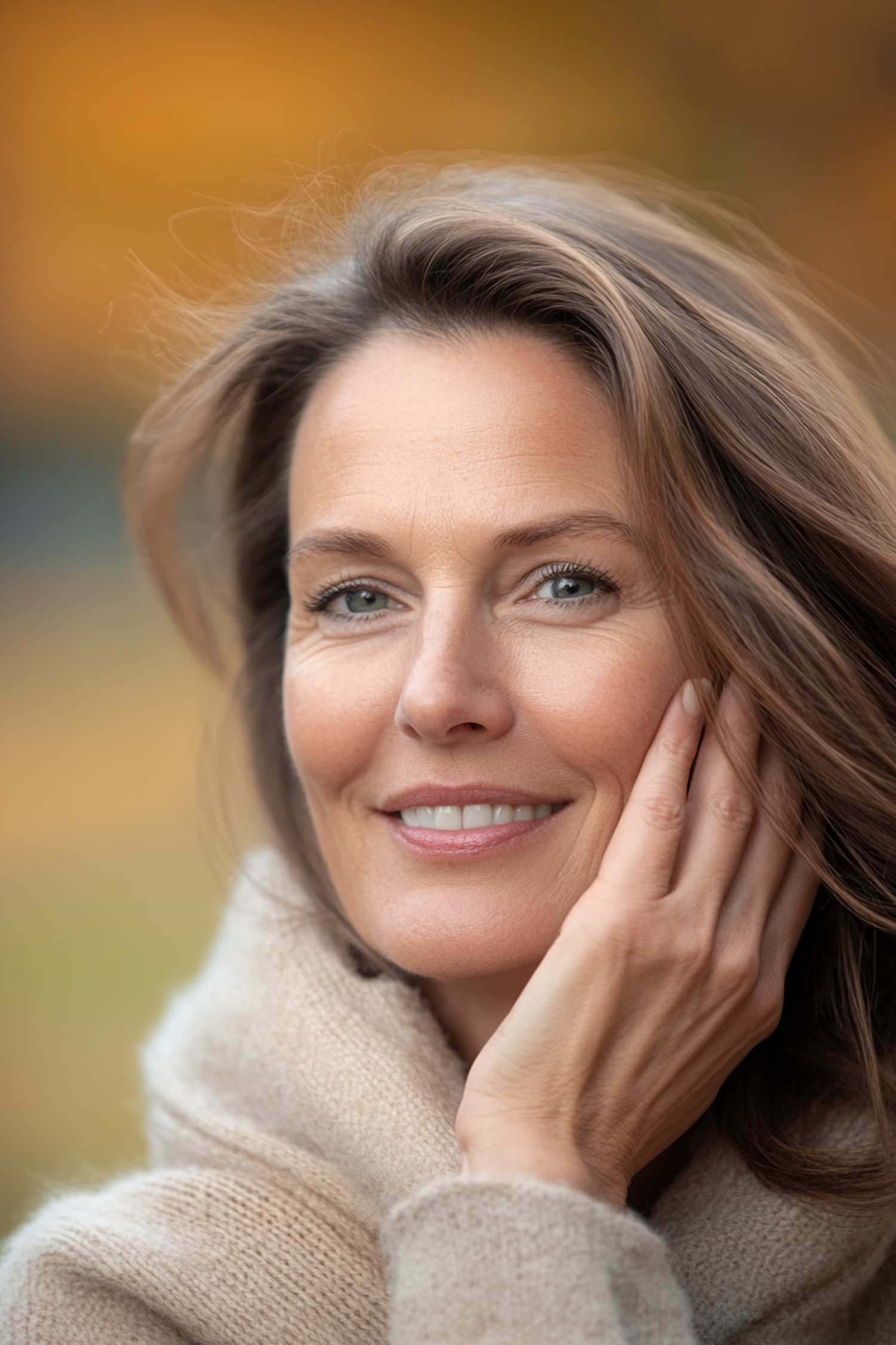 Caucasian woman with light brown hair and blue eyes, smiling warmly in a beige sweater against a blurred autumn background.