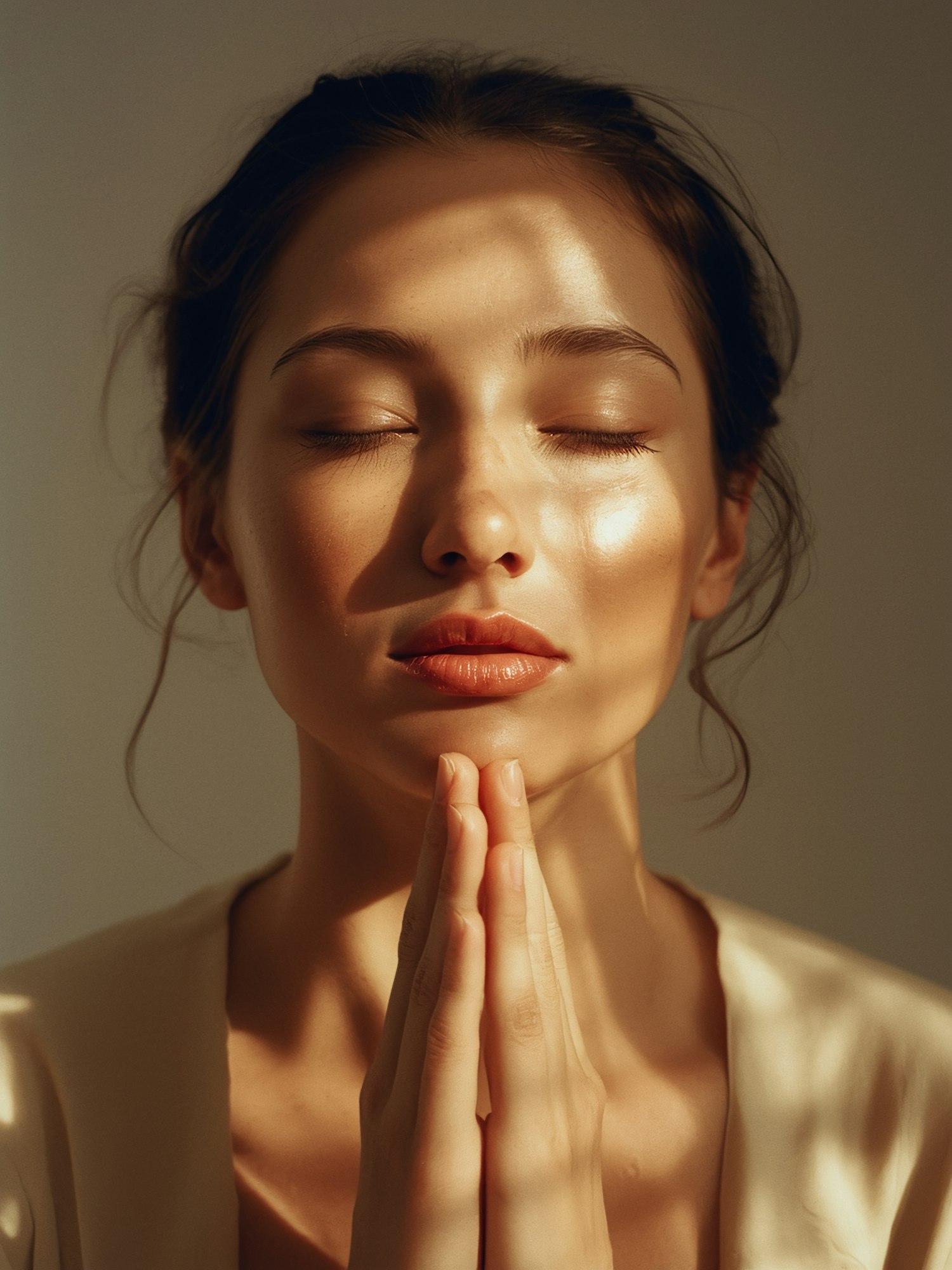 A serene portrait of a woman with closed eyes, softly lit, conveying calm and introspection with warm tones and delicate shadows.