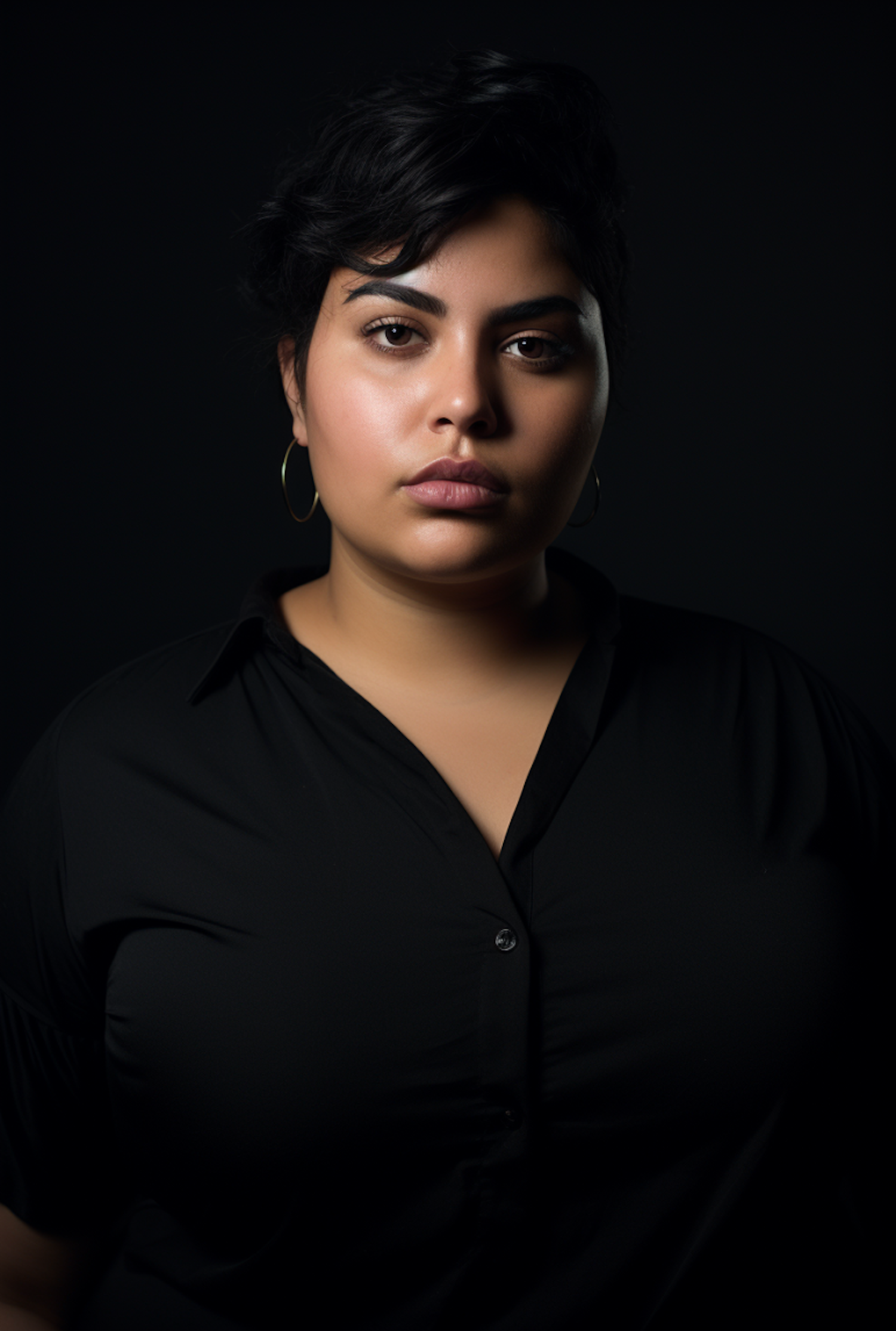 Portrait of a woman with short dark hair and hoop earrings, wearing a black shirt against a dark background.