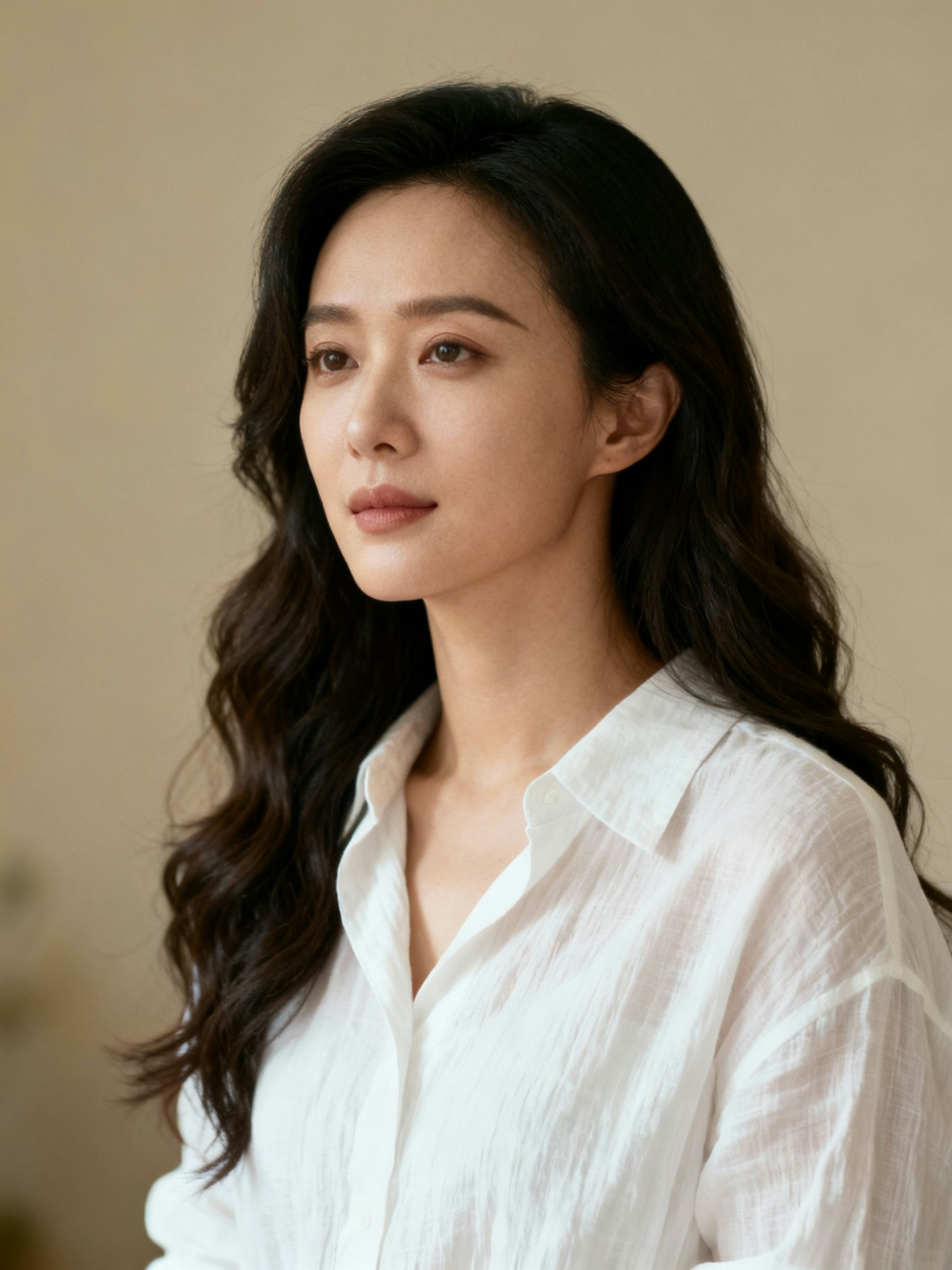 Cinematic portrait of a chinese woman, 26; long wavy hair; white linen shirt. Background: plain beige, defocused.