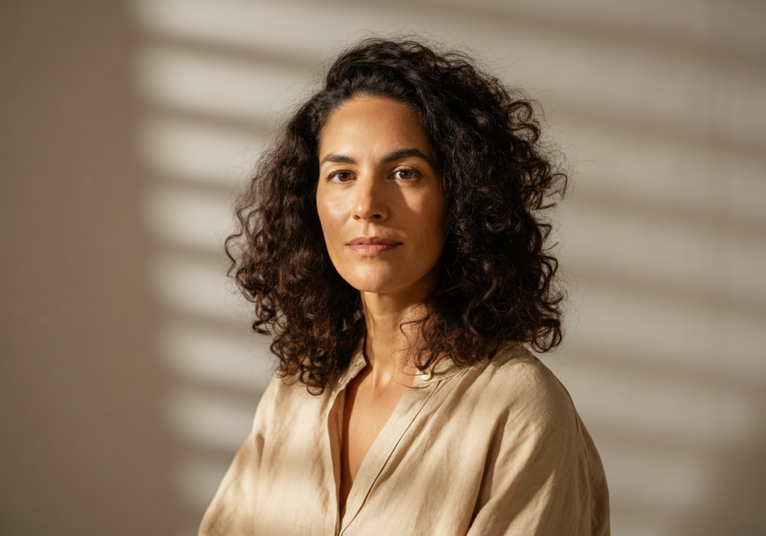 A woman with curly dark brown hair and a beige blouse sits in soft lighting, with striped shadows creating a warm, serene vibe.