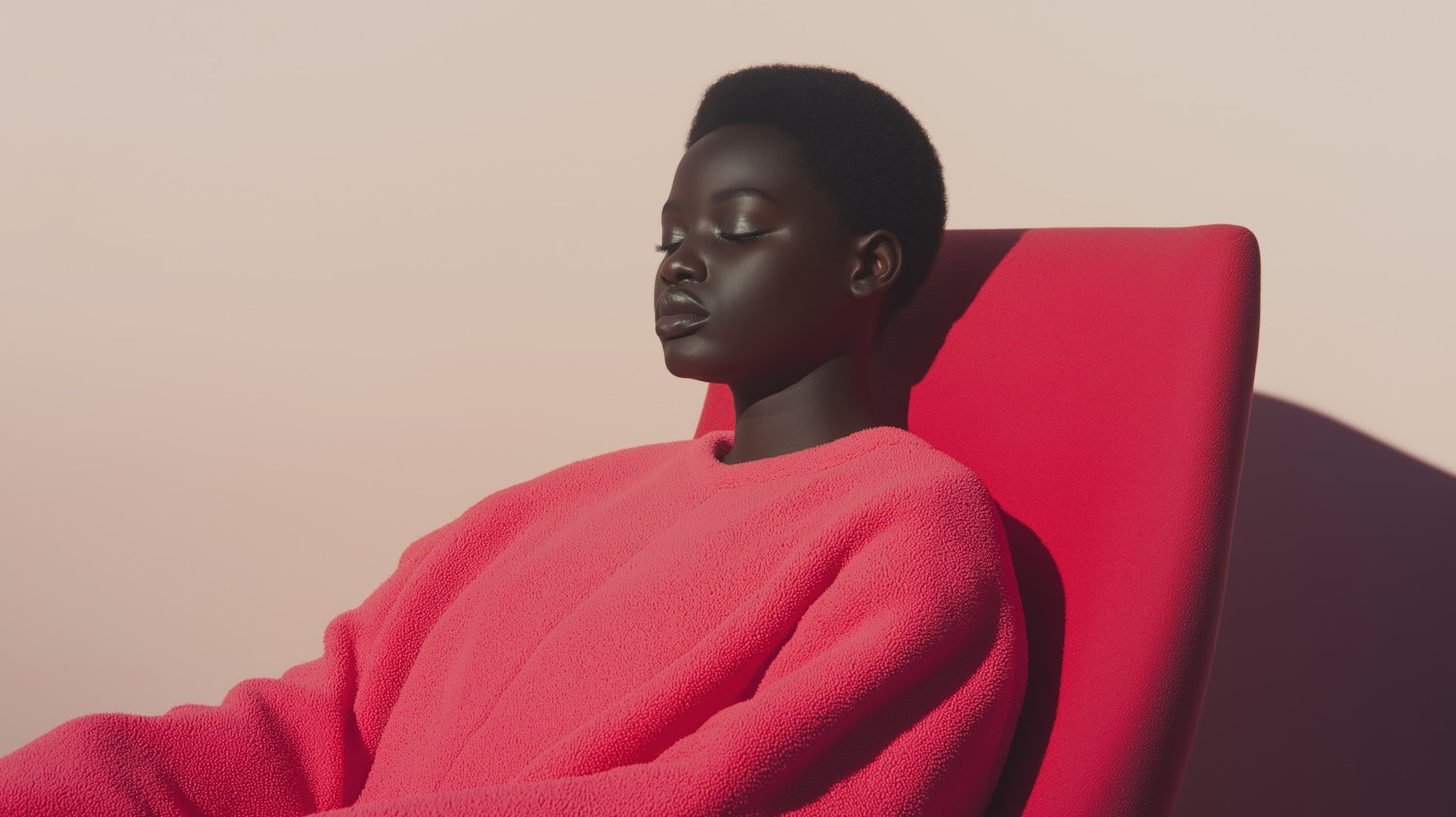 A serene portrait of a woman in a pink sweater, seated in a red chair against a beige background, exuding calm and minimalism.
